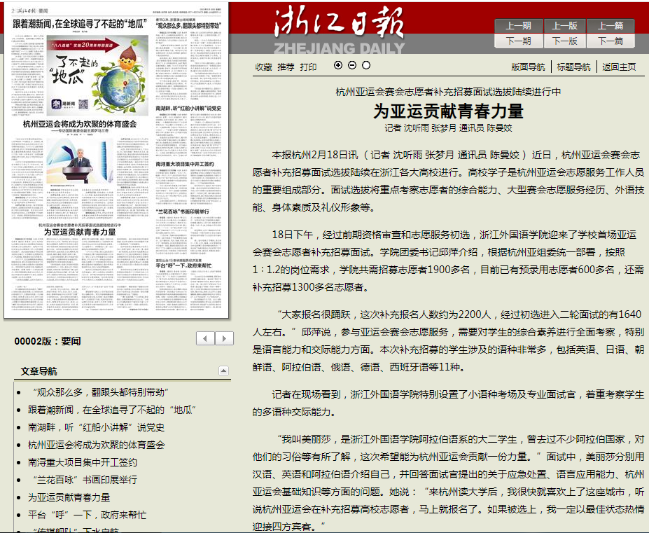 2月18日至20日,人民网、光明网、中国新闻网、浙江日报2版要闻、杭州亚运官网、中国蓝新闻客户端、潮新闻等分别以《杭州亚运会补充招募面试选拔赛会志愿者》《杭州亚运会、亚残运会赛会志愿者补充招募面试选拔有序进行》《杭州亚运会赛会志愿者补充招募面试选拔陆续进行中 为亚运贡献青春力量》《用不同语种传达热情!杭州亚运会赛会志愿者补充招募面试选拔进行中》《严选!杭州亚运补招3万名赛会志愿者 关键词“专业”》等为题,报道了开云官网开展杭州亚运会赛会志愿者补充招募面试选拔情况。