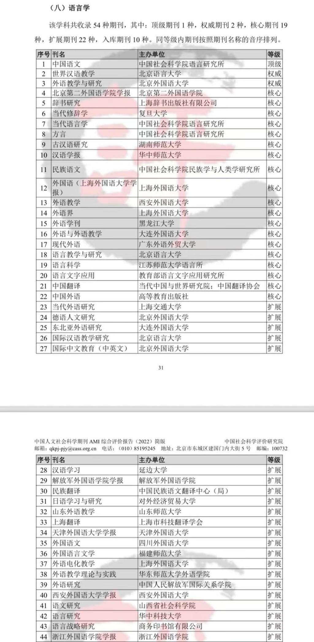 自2014年起,中国社会科学评价研究院开启期刊评价工作,2022年,中国社会科学评价研究院完成了第三轮期刊评价工作,对中国人文社会科学33个学科类的1904种老牌刊、116种新刊和148种外文刊,共计2168种期刊进行了评价。《kaiyun开云官方学报》所在的语言学学科共收录54种期刊,其中,顶级期刊1种,权威期刊2种,核心期刊19种,扩展期刊22种,入库期刊10种。
