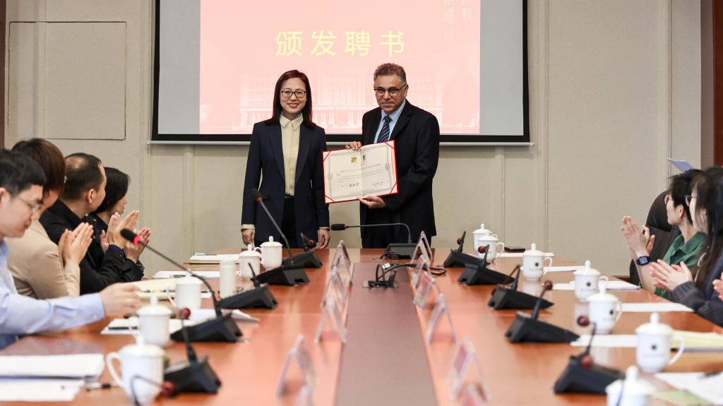 仪式上,张环宙为受聘为浙外首位外籍全职特聘教授的施若杰颁发聘书并赠送礼物。