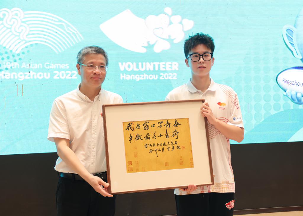 校党委书记宣勇在致辞中寄语志愿者们,再过百天,举世瞩目、万众期待的杭州第19届亚运会将在壮丽恢宏的钱塘江畔拉开帷幕,届时,浙外小青荷们将披甲执锐,奔赴战场,在亚运舞台上放飞青春梦想。宣勇希望浙外“小青荷”们要坚定理想信念,做红色根脉的守护者,胸怀国之大者,以为国争光为己任,坚定文化自信,向世界呈现自信自强、大气开放的中国风采,在热情服务中为人类命运共同体贡献中国智慧和中国力量。要保持奋斗激情,做志愿精神的代言人,在砥砺奋进中磨炼意志、千锤百炼,提升服务亚运的能力;在砥砺奋进中积蓄能量、厚积薄发,助力成就人生梦想。要勇于追求卓越,做亚运服务的弄潮儿,以事必尽善、善作善成的态度和极端负责、极端认真的精神,执着专注、一丝不苟地投入到各项工作中,坚持最高标准、最严要求,把承担的任务出色完成好,不断突破自我。