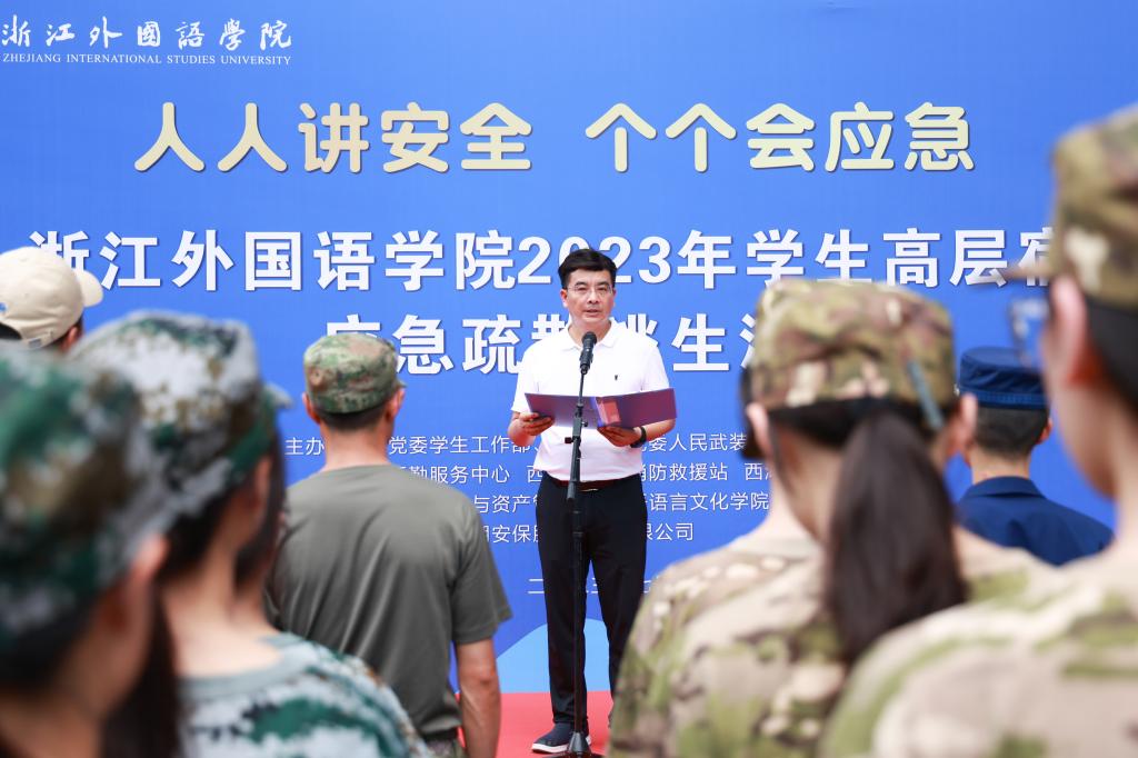 校学工部、学生处,人武部、保卫处,后勤中心等单位负责人及各二级学院相关负责人、辅导员,2022级全体学生,以及2022级军训教官、留下消防救援站消防指战员、留下派出所民警、杭州西湖安保服务集团有限公司负责代表等参加活动。