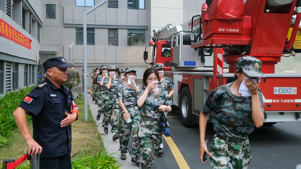 随后,学生们在教官组织下参加了高层建筑消防安全知识的培训。