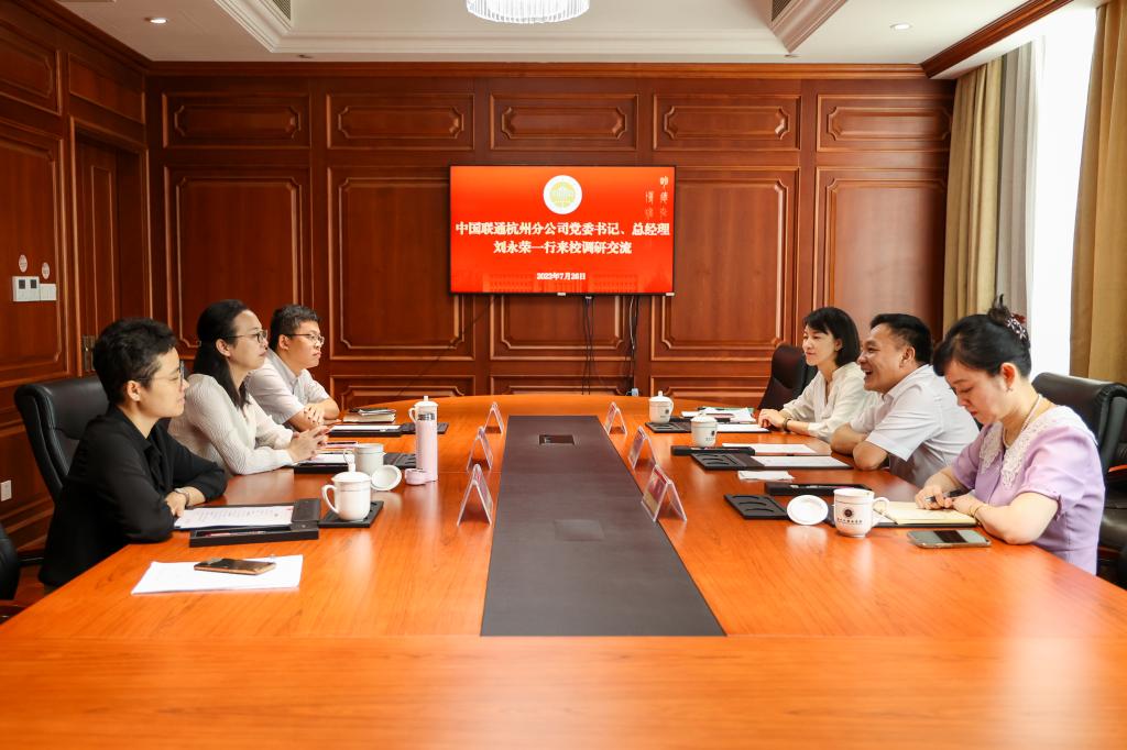 7月26日,中国联通杭州分公司党委书记、总经理刘永荣一行来校调研座谈。校长、党委副书记张环宙出席。