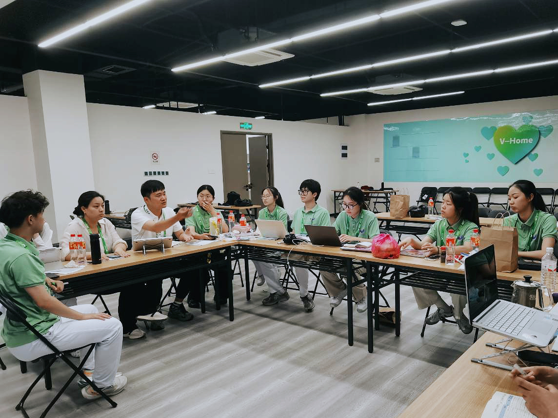 顾蒙(左三)给志愿者们开工作复盘会。