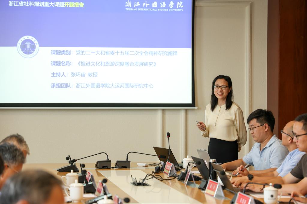 张环宙代表学校感谢专家们的到来。她简要介绍了学校的发展情况,并作了关于浙外国际化和浙外文旅高质量发展的主题发言。张环宙分析了新时代外语类高校服务国家战略发展的必要性和可行性,指出讲好中国故事是满足国家外交战略新需求、浙江“重要窗口”新需求以及推动外语类院校高质量发展的内在使命。她介绍了学校的使命、“三地四域”战略布局,以及学校推进转型升级建设新型高水平大学的思路举措,并基于此,提出今后三个重点研究方向的设计和团队建设构想。
