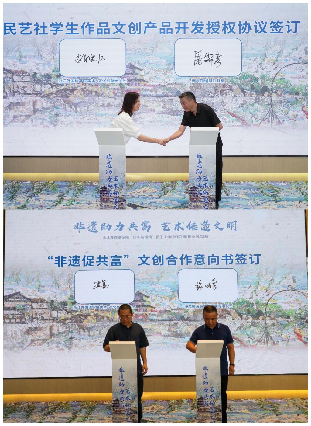 艺术学院与浙江瑞帛汇丝绸有限公司签订民艺社学生作品文创产品开发授权协议。美术·文化创意研究所和洲泉镇湘源文旅发展有限公司签订“非遗促共富”文创合作意向书。