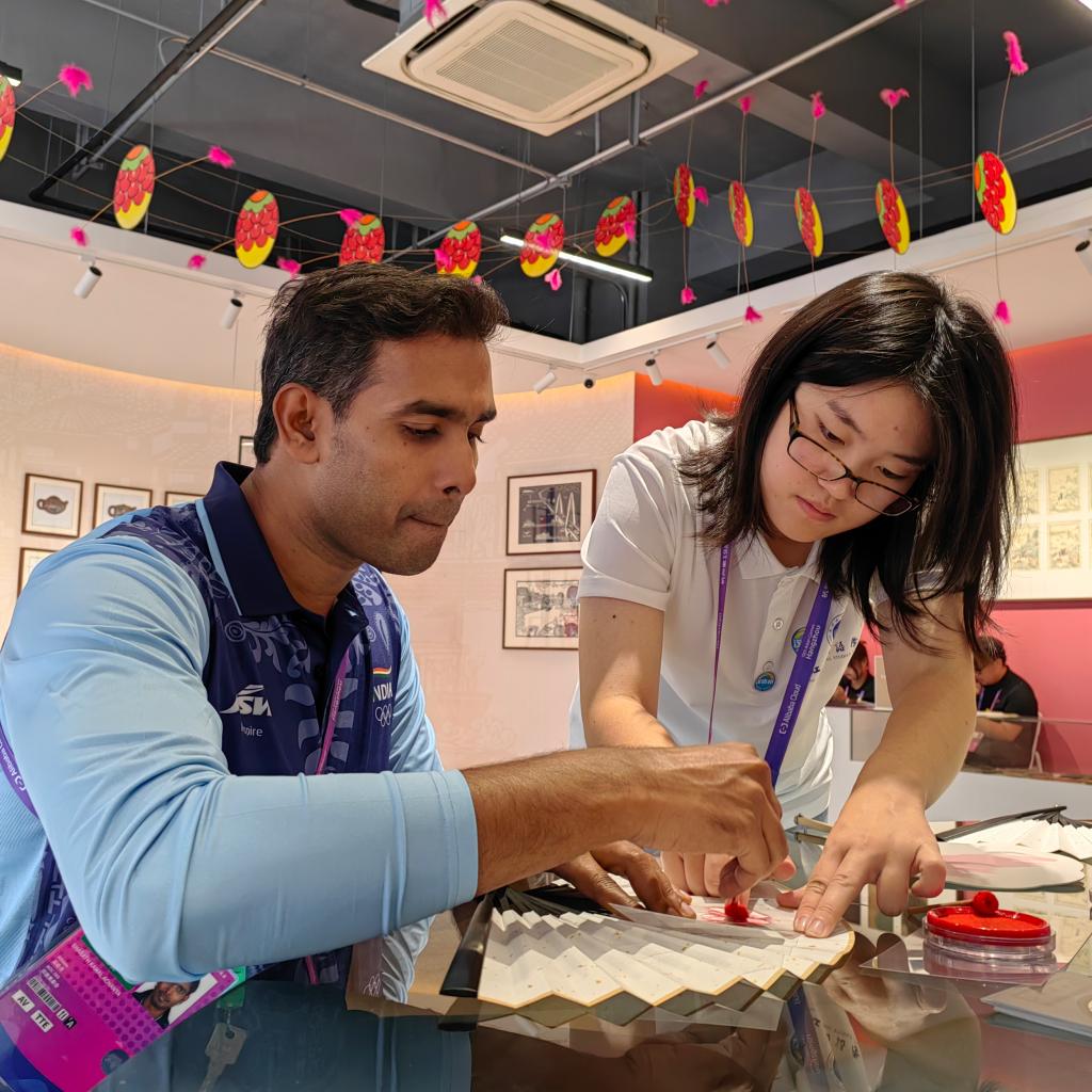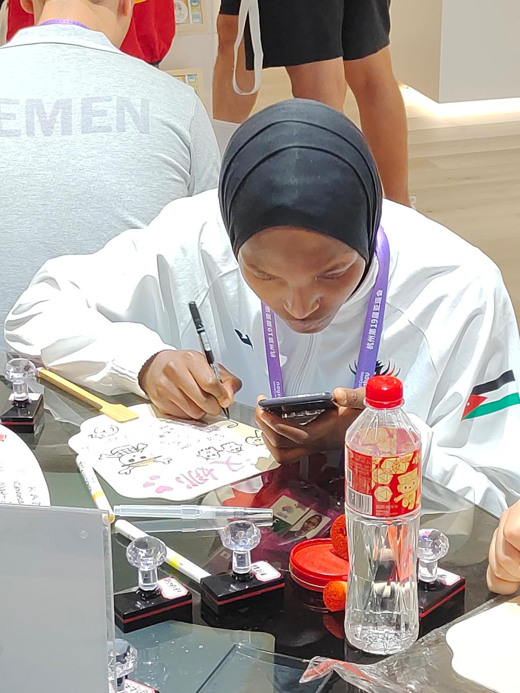 约旦运动员Hanan Nassar对汉字产生了浓厚的兴趣,她用彩色画笔在扇上写出了自己的中文名字“汉娜”,并绘制了喜欢的图画。