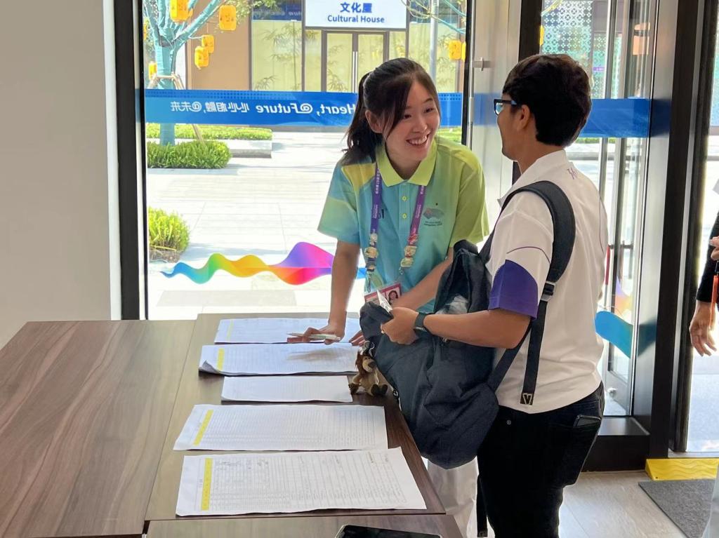 文化屋是中国文化与亚运会文化完美融合。在这里,王浩杰热情迎接每一位前来参观的外国友人,积极提供规范的引导和讲解服务。每当外国友人进入文化屋参观时,他都会主动向前与其交流,向他们讲解中国文化。“主动服务意识尤为重要,它是我们与客户群体建立良好对话氛围的关键。”