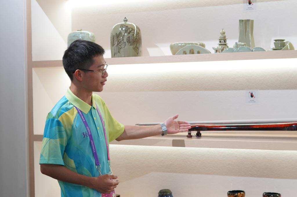 “文化屋里展陈的琴棋书画、诗书画印、王星记扇、榫卯结构、越窑青瓷、天目漆器、3D互动八段锦、AI围棋对弈等,是记者们每天打卡最频繁的体验项目。”王浩杰介绍说,文化屋的讲解工作非常考验志愿者的记忆力和文化素养。他不仅要掌握大量非遗文化知识、历史知识,还要熟练运用非遗专用英语词汇向客户群介绍中国文化。