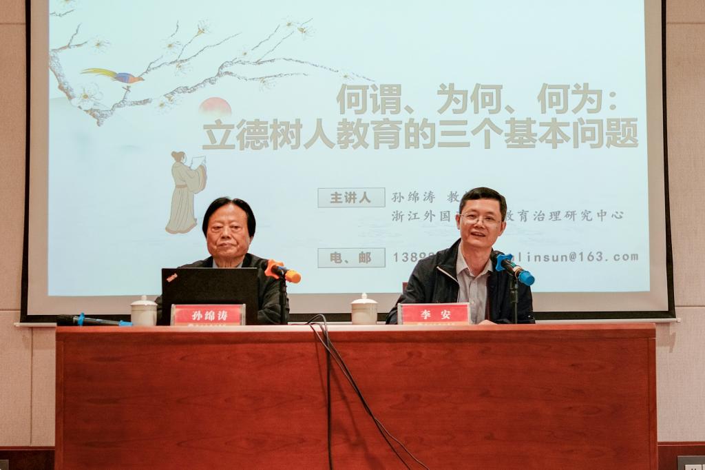 教育学院孙绵涛教授作题为《何谓、为何与何为:立德树人教育的三个基本问题》讲座。他结合亲身感悟,语重心长地为新教师们阐释了什么是立德树人教育、为什么要进行立德树人教育,以及怎样进行立德树人教育。
