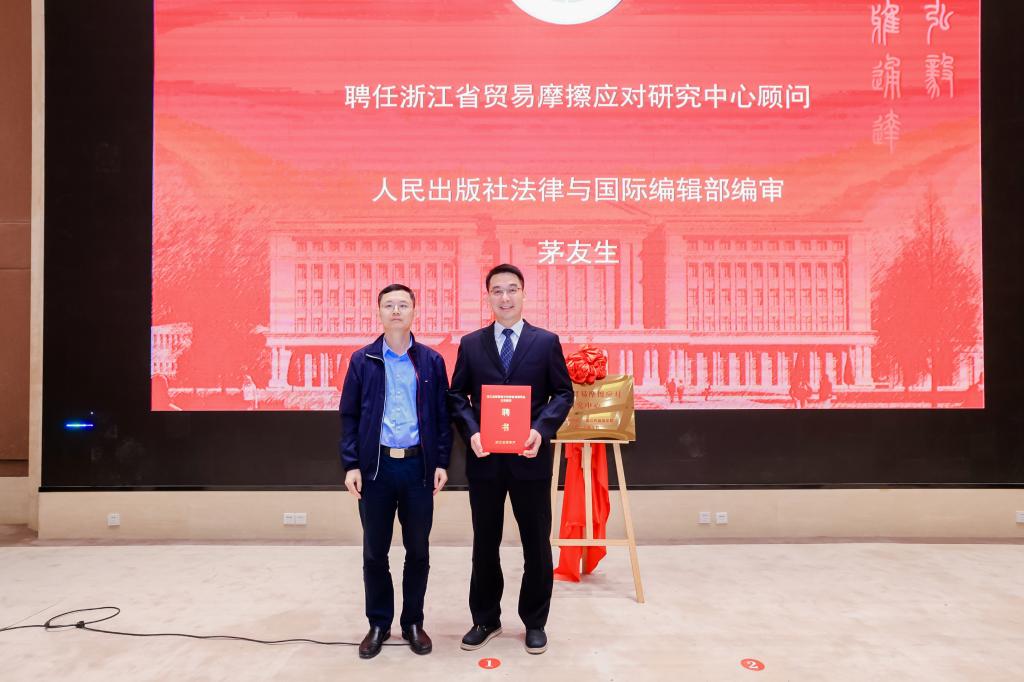 张钱江为受聘为贸易救济专家咨询委员会的专家委员颁发聘书。李安为研究中心受聘人员颁发聘书。
