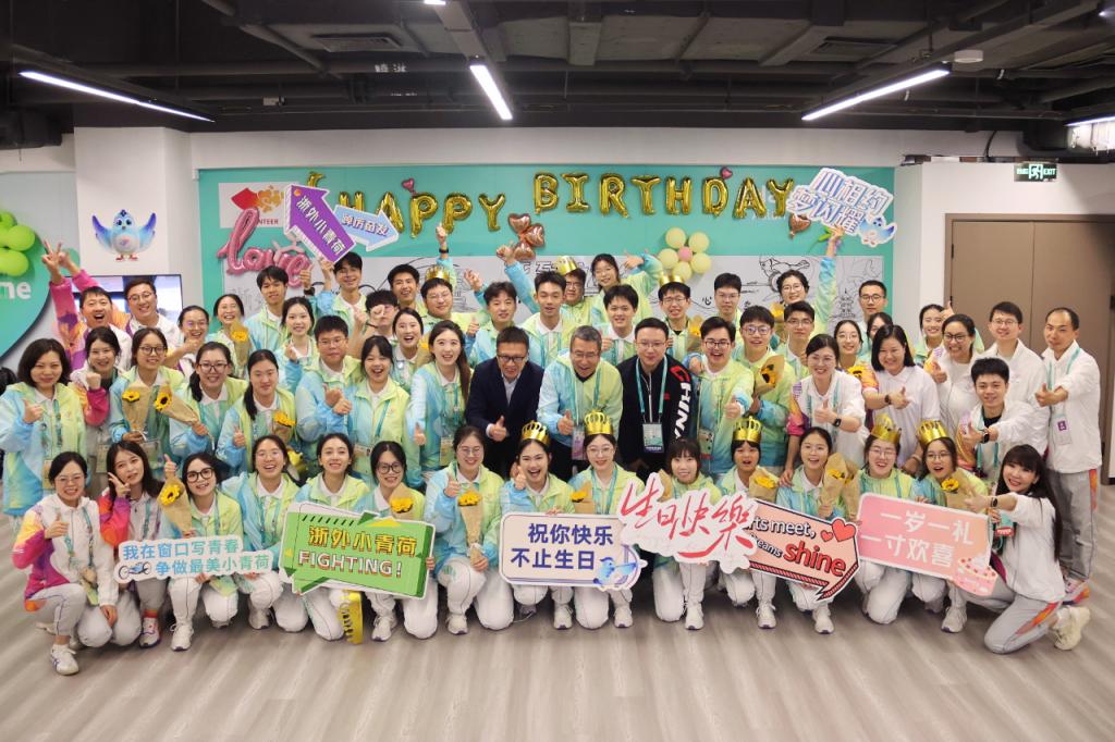在《生日快乐歌》的歌声中,白岩松为10月过生日的小青荷们庆祝集体生日,与大家合影留念,还一同画下了可爱的“飞飞”志愿者形象。