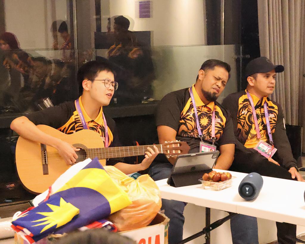 能架起沟通桥梁的不只有语言,还有歌声和舞蹈。“我会牢牢记住你的脸,我会珍惜你给的思念,这些日子在我心中永远都不会抹去……”优美的吉他和弦和歌声中,NOC/NPC助理乐嘉骏与即将回国的马来西亚代表团说“再见”。即使听不懂歌词,外国友人们也沉浸其中,举起手机记录这感人时刻。那个告别的夜晚,那首《再见》,那雷鸣般的掌声,久久地存在大家的心中。