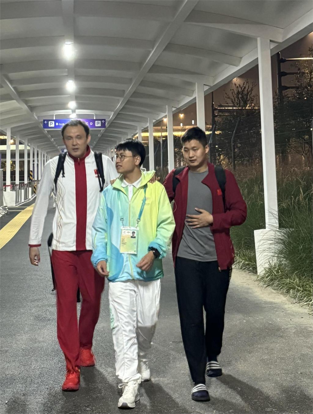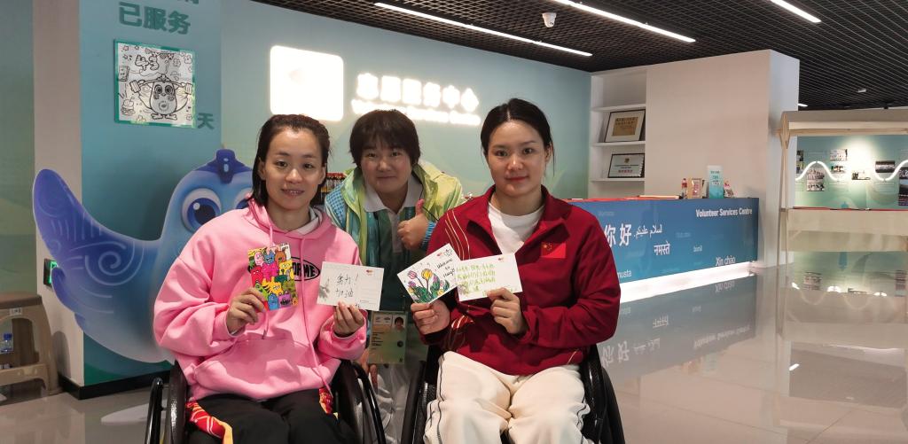 黄文璇(中)与中国运动员在志愿服务中心。