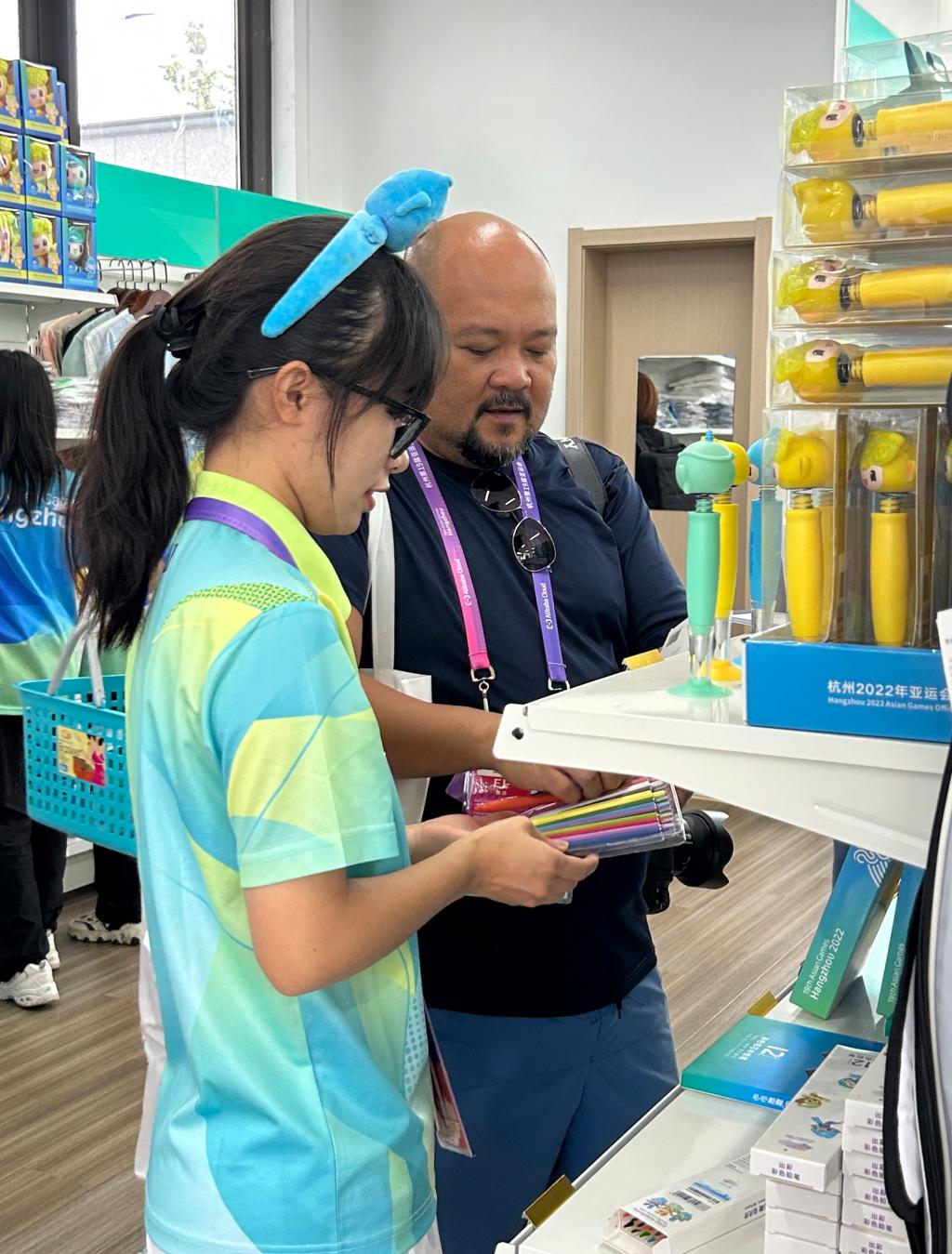 李嘉雯向外国记者介绍亚运特许店商品特色。