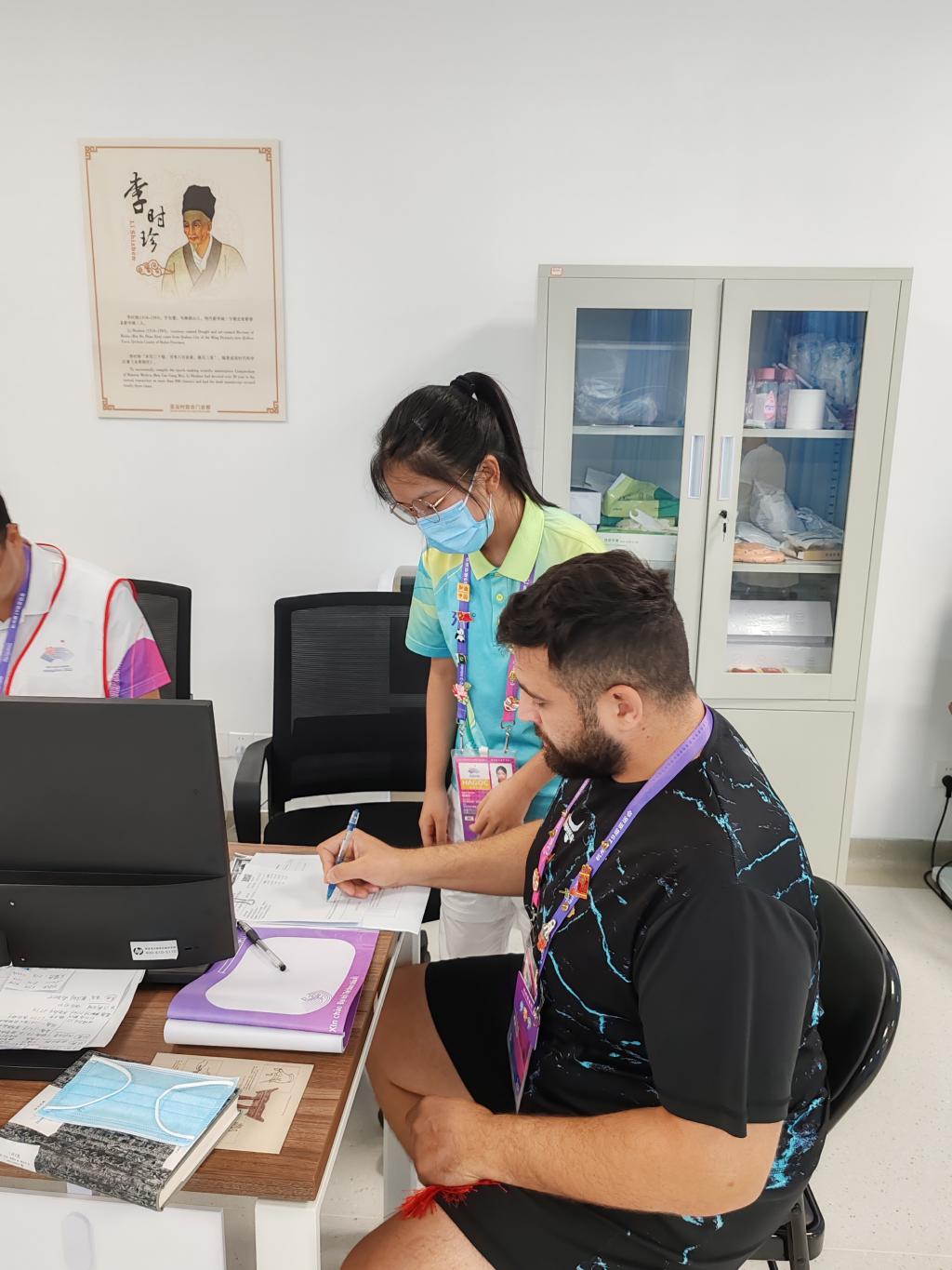 钱瑶佳为前来问诊的外国运动提供咨询服务。
