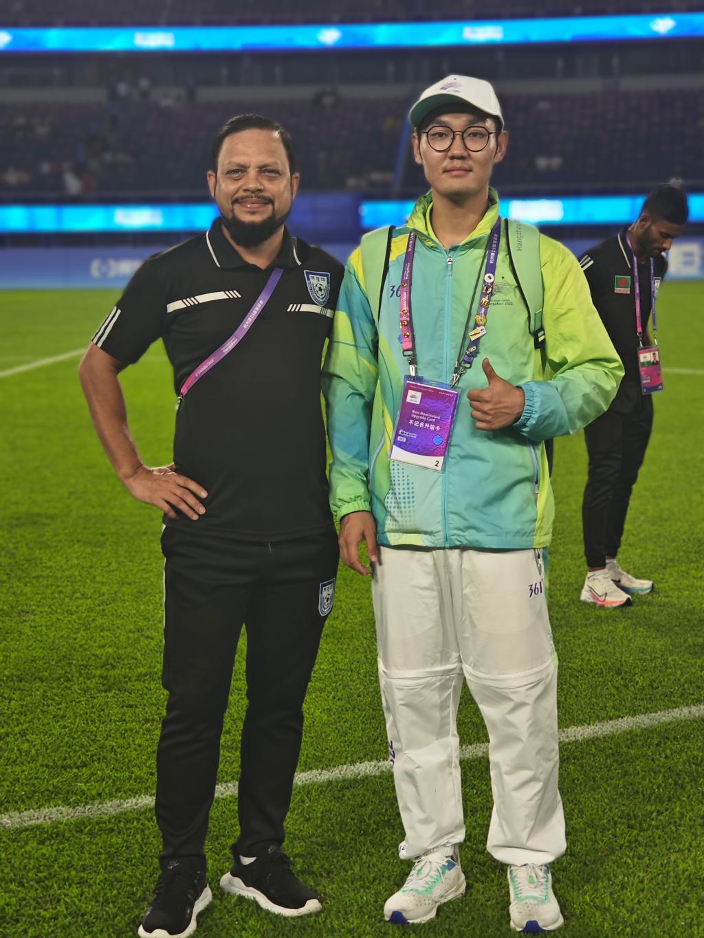 曹彦生与孟加拉国男足领队教练在黄龙体育馆。
