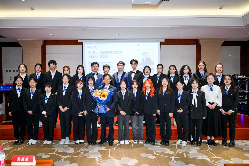黄惠康教授以“外交人、外交事、外交魂”为题,为师生们讲授了生动的第一课,也开启了第二届校园普法文化节的首场讲座。他介绍了国际法的地位与重要性,“大国外交必重国际法”,让法治精神在国际关系中彰显是现代外交的目标之一,也是推动构建人类命运共同体的法律保障。他指出,外交人员要以赤子之心对待党和国家的外交事业,而“不辱使命”是对外交人员的要求。他以自己“外交老兵”和“浙外之友”的双重身份向同学们提出殷切希望,并寄语同学们“志存高远、追求卓越、梦在远方、路在脚下”,希望同学们努力成长为一名优秀的涉外法治人才。
