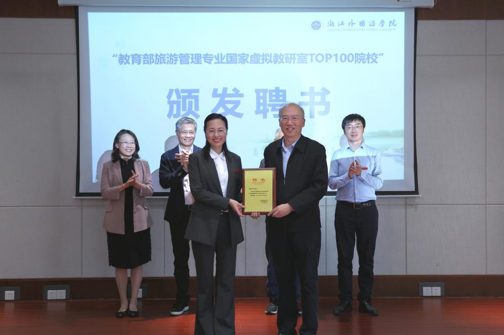 会上,浙外被授予“教育部旅游管理专业国家虚拟教研室TOP100院校”,马勇为张环宙颁发“教育部旅游管理专业国家虚拟教研室副主任”聘书。
