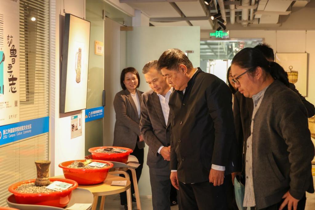 校党委副书记赵文波陪同单霁翔参观了学生文化社区,观看了“绘眼行记·访鲁寻志”作品展、国家非遗蓝印花布及衍生品学生作品展等。