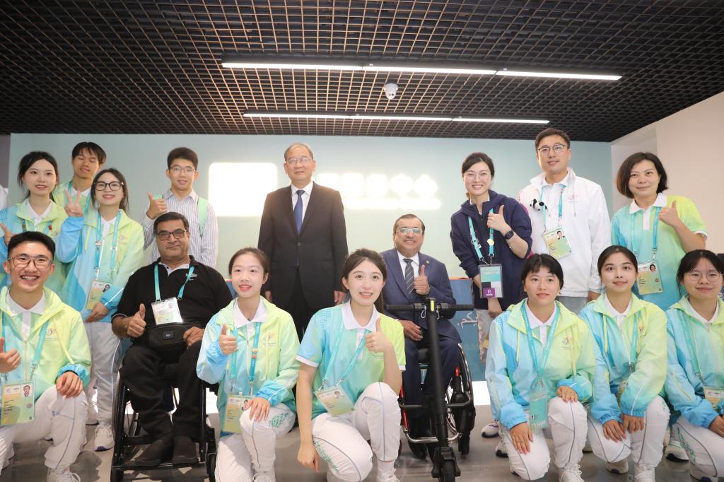 10月22日,亚残奥委员会主席马吉德·拉什德看望慰问浙外“小青荷”,他参观了志愿文化展示区,体验了中国传统文化,并与浙外“小青荷”亲切交流,衷心感谢“小青荷”为亚残运会做出的志愿服务并手写明信片表达感谢。