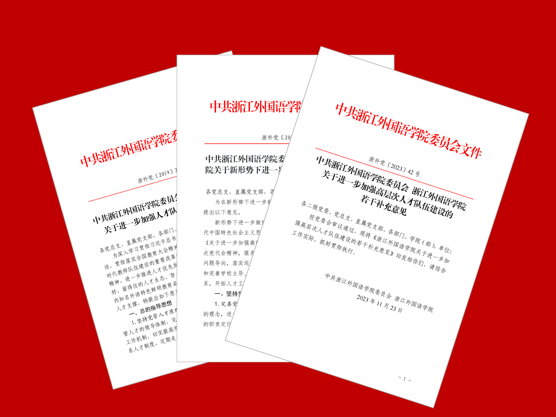 学校党委高度重视人才工作,始终将人才工作放在事关学校发展的战略高度一体谋划、部署和推进。围绕“坚持党管人才原则,实行更加积极、更加开放、更加有效的人才政策”“真心爱才、悉心育才、精心用才,把各方面优秀人才集聚到党和人民的伟大奋斗中来”等重要精神,先后制定出台《关于进一步加强人才队伍建设的若干意见》《关于新形势下进一步做好人才工作的意见》(“浙外人才新政10条”)《关于进一步加强高层次人才队伍建设的若干补充意见》等制度,进一步发挥党委对人才工作的总揽全局和协调各方作用,进一步树牢各单位“大人才观”理念,进一步理顺学校高层次人才体系,打造学校主导、学院主体、部门协同、上下联动的人才工作体制。