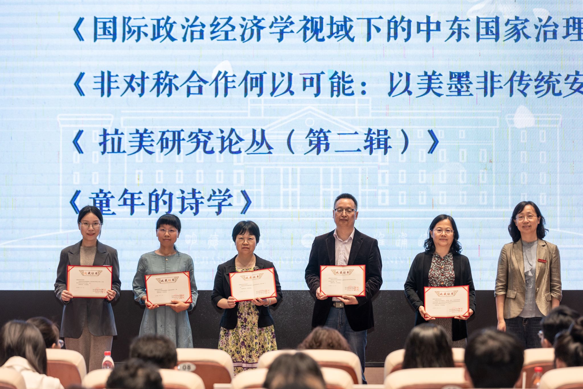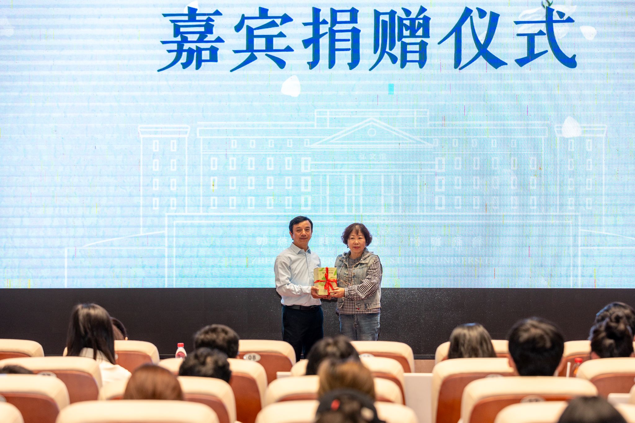 现场举行了博雅阁藏书仪式,5位教师代表将新出版的著作捐赠于学校博雅阁。洪明为教师代表颁发收藏证书。