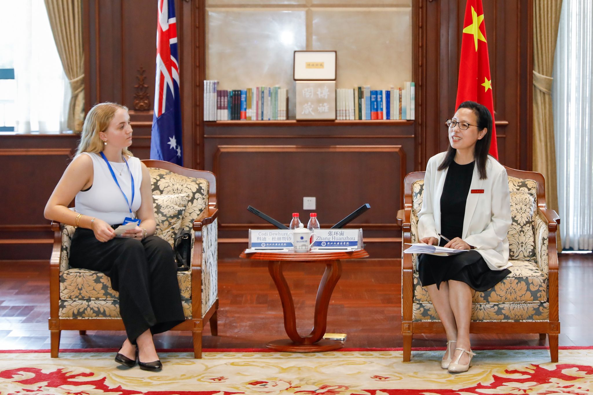 张环宙以“师范起家”“国际底色”“民间友好”三个关键词向远道而来的友人介绍了浙外。她强调了青年在促进中澳关系中的重要作用,对澳大利亚全球发展协会致力于推动中澳青年交流表示赞赏,并着重从教育教学、朋辈对话和文化交流三个方面分享了学校在推动中外青年交流方面的努力与成效。她表示,浙外坚信交流是塑造青年、塑造未来的重要路径,学校愿与澳大利亚全球发展协会一道,联合一切积极力量,共建一个或多个青年策划、青年组织、青年受益的国际交流平台,让更多有想法、有创造力的中澳青年可以互相学习借鉴,为两国人民加深理解搭建桥梁。