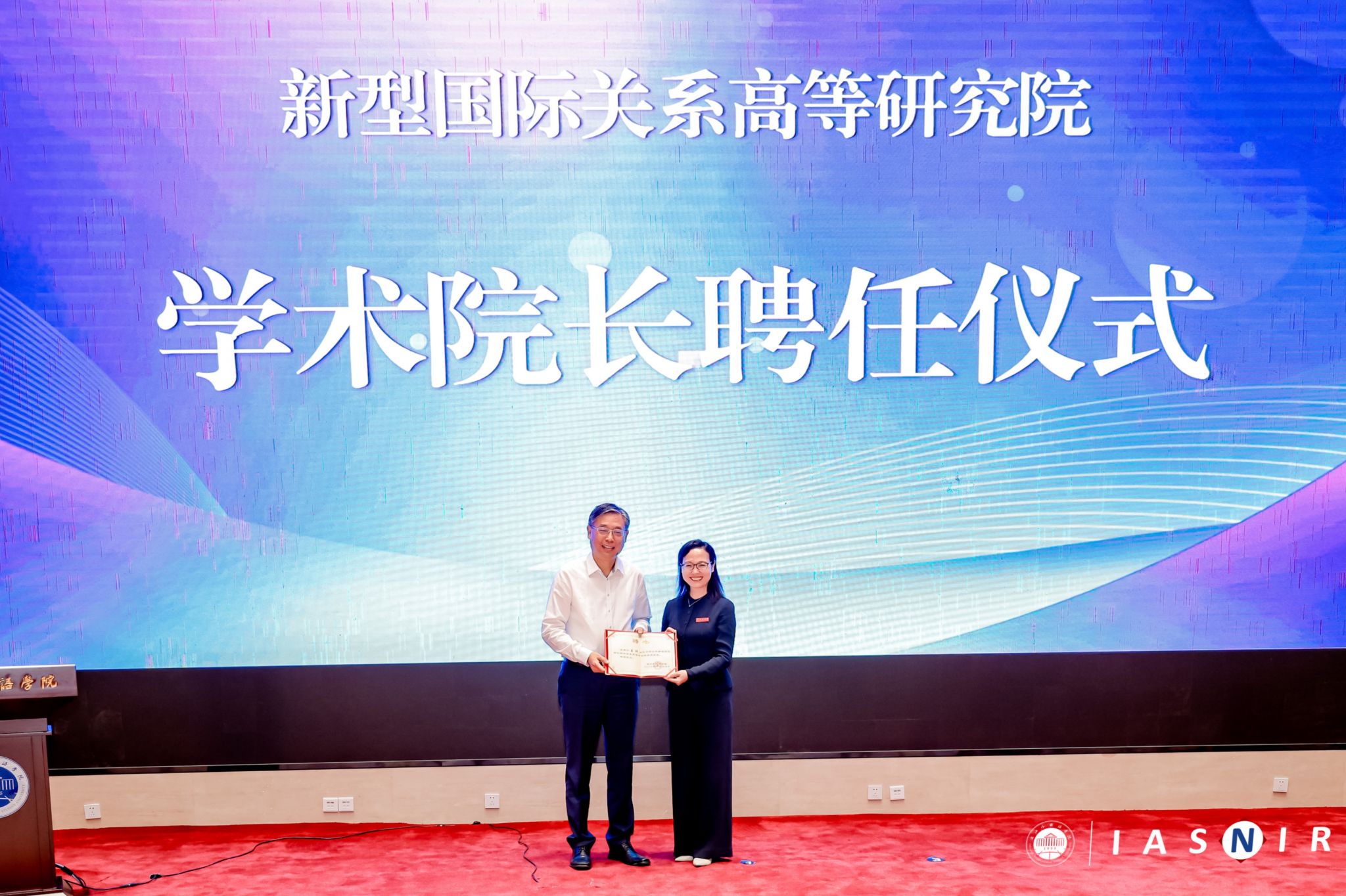 国务院学位委员会区域国别学学科评议组召集人、上海外国语大学原党委书记姜锋教授受聘为高研院学术院长。张环宙为姜锋颁发聘书。