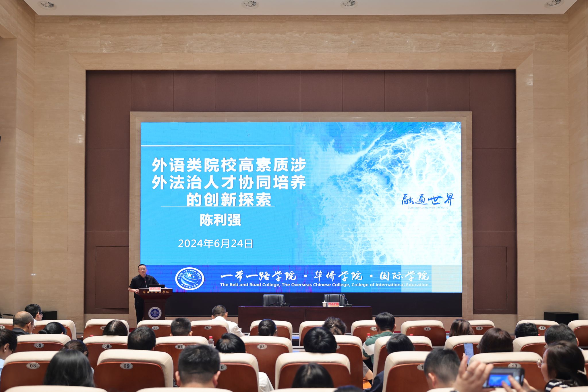 “一带一路”学院、华侨学院、国际学院执行院长陈利强以“外语类院校高素质涉外法治人才协同培养的创新探索”为题作交流发言。他从当前涉外法治人才队伍的发展现状出发,讲解了涉外法治人才的培养目标和推进思路,分享了学院在涉外法治人才培养方面的创新探索和实践成果。