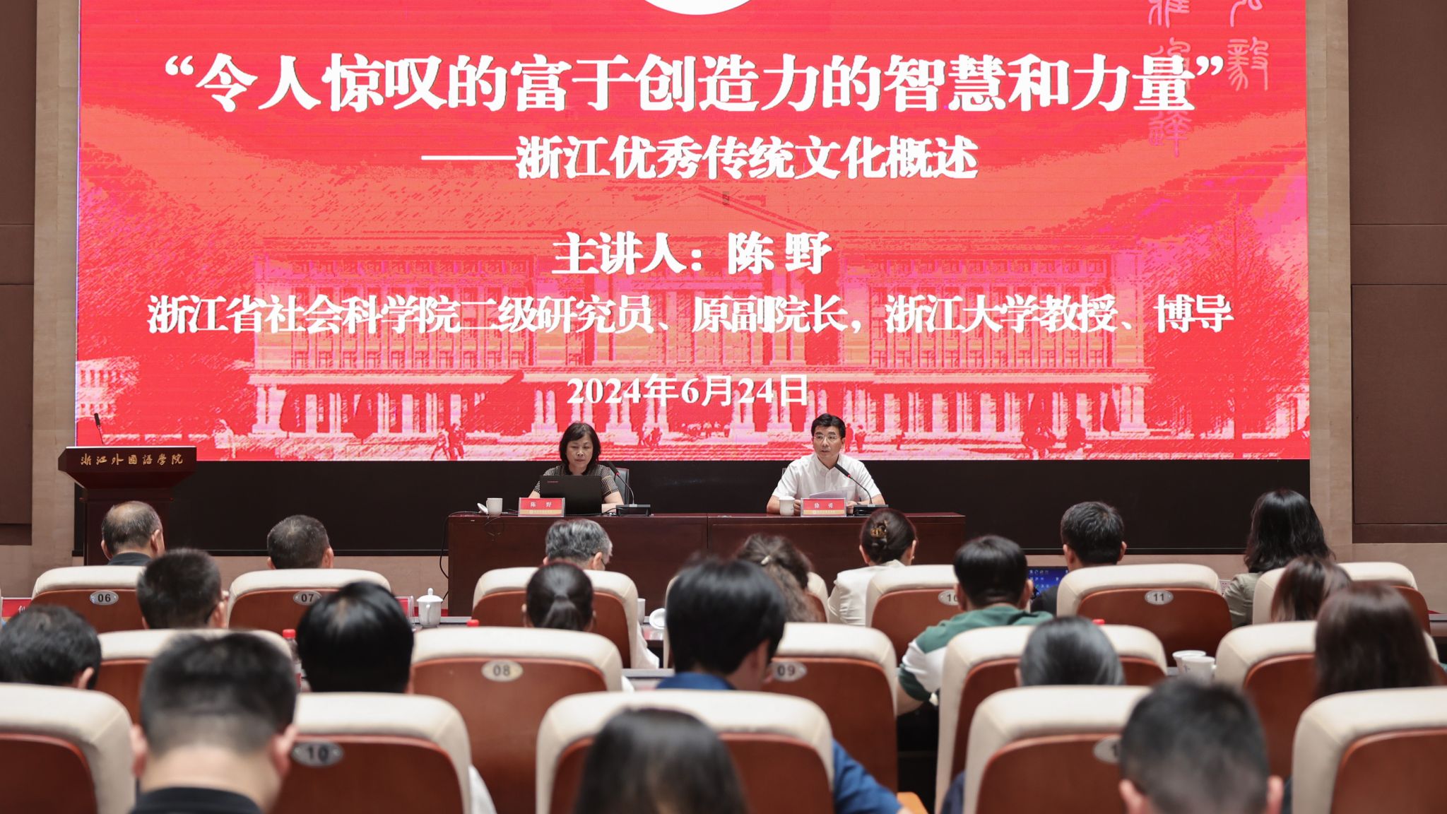 为深入学习贯彻习近平文化思想,深刻理解浙江优秀传统文化,6月24日,浙外举办“浙江优秀传统文化”辅导报告会。浙江省社会科学院二级研究员、原副院长陈野以“令人惊叹的富于创造力的智慧和力量”为题作专题辅导报告。校党政领导班子成员出席。党委副书记徐勇主持报告会。本次报告会是一次党委理论学习中心组(扩大)学习会。