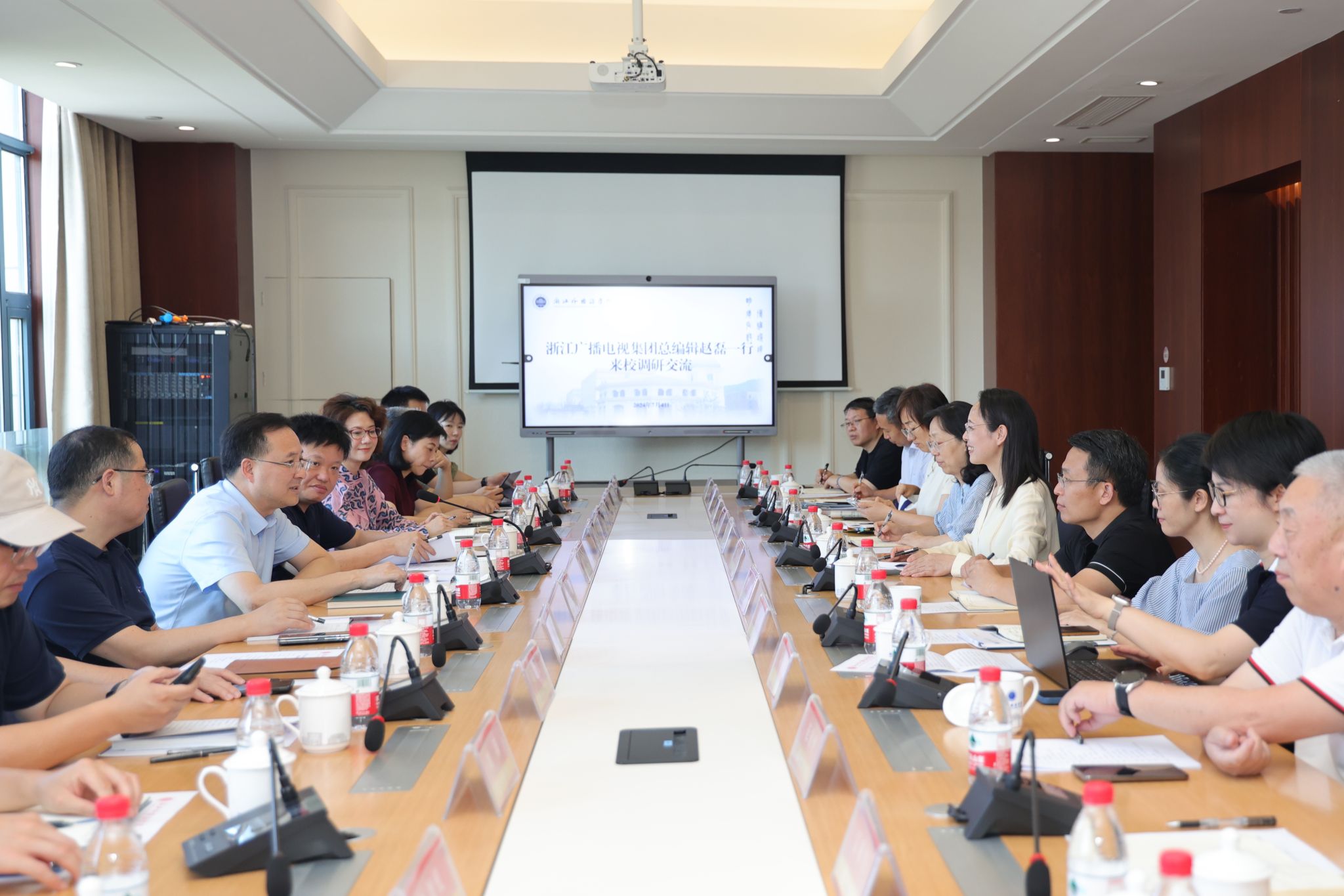 7月4日,浙江广播电视集团党委副书记、总编辑赵磊一行来校调研,共谋战略合作。会前,校党委书记宣勇会见了赵磊一行。校长、党委副书记张环宙主持座谈会。副校长、党委委员毛振华,党委委员、宣传部部长、科研处处长、学科办主任洪明出席。