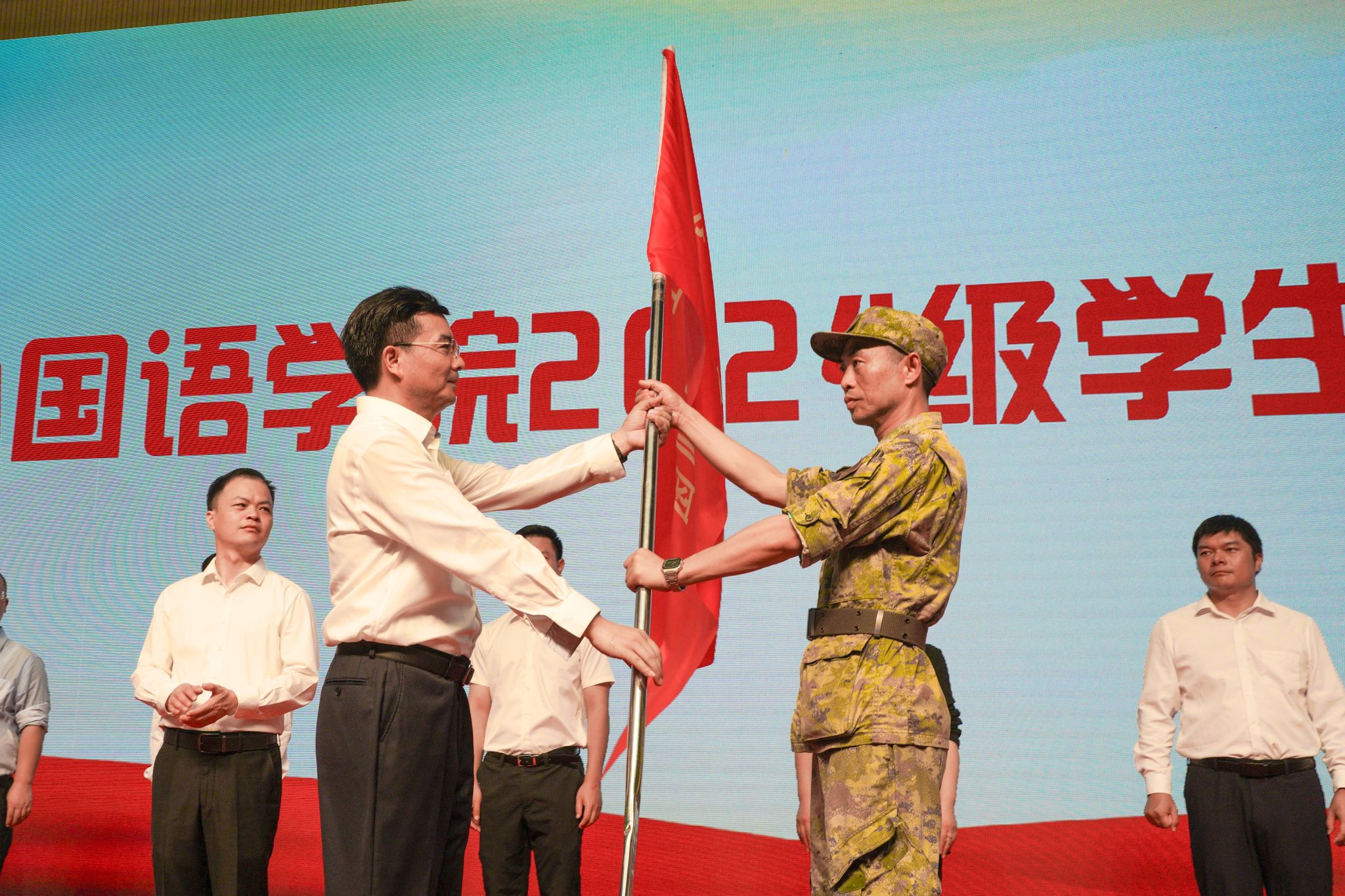 徐勇宣读了军训团干部名单,代表学校向军训团授旗,吴克武向各军训营授旗。