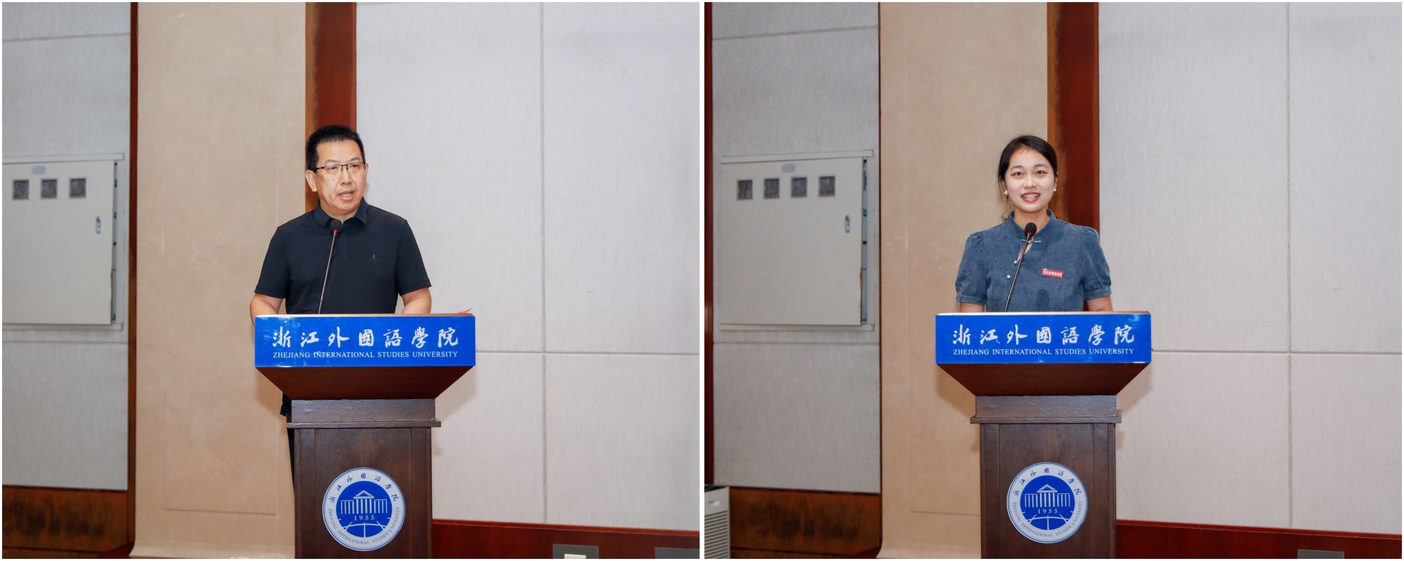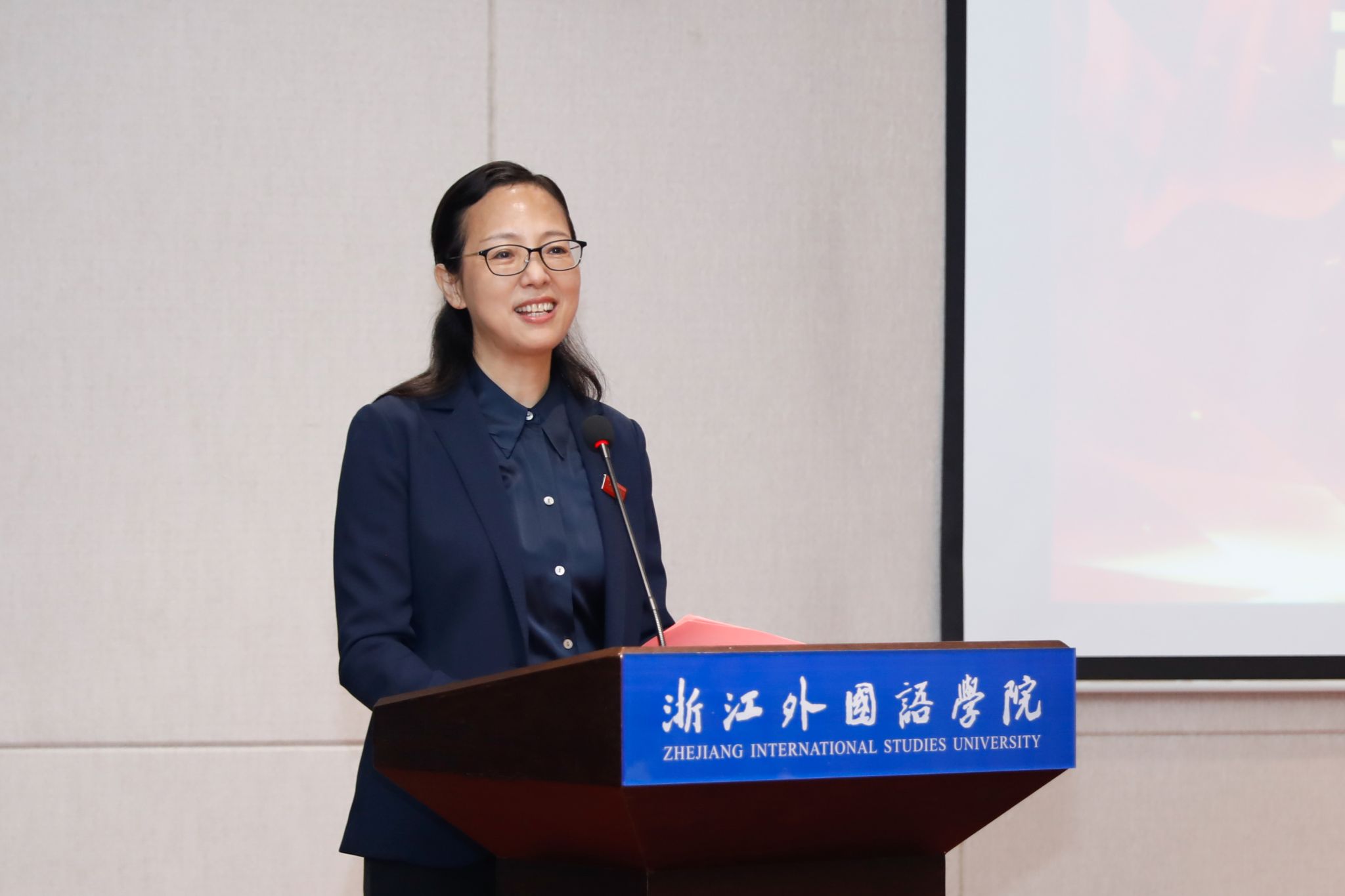 浙外优秀校友、青年教师杨楚乔博士代表新入职年轻教师发言。她深情回顾了在母校学习、生活的时光,并代表全体新教师表态,将聚焦学校新的发展定位,一丝不苟对待教学任务、脚踏实地提高科研水平,努力贡献青春力量。