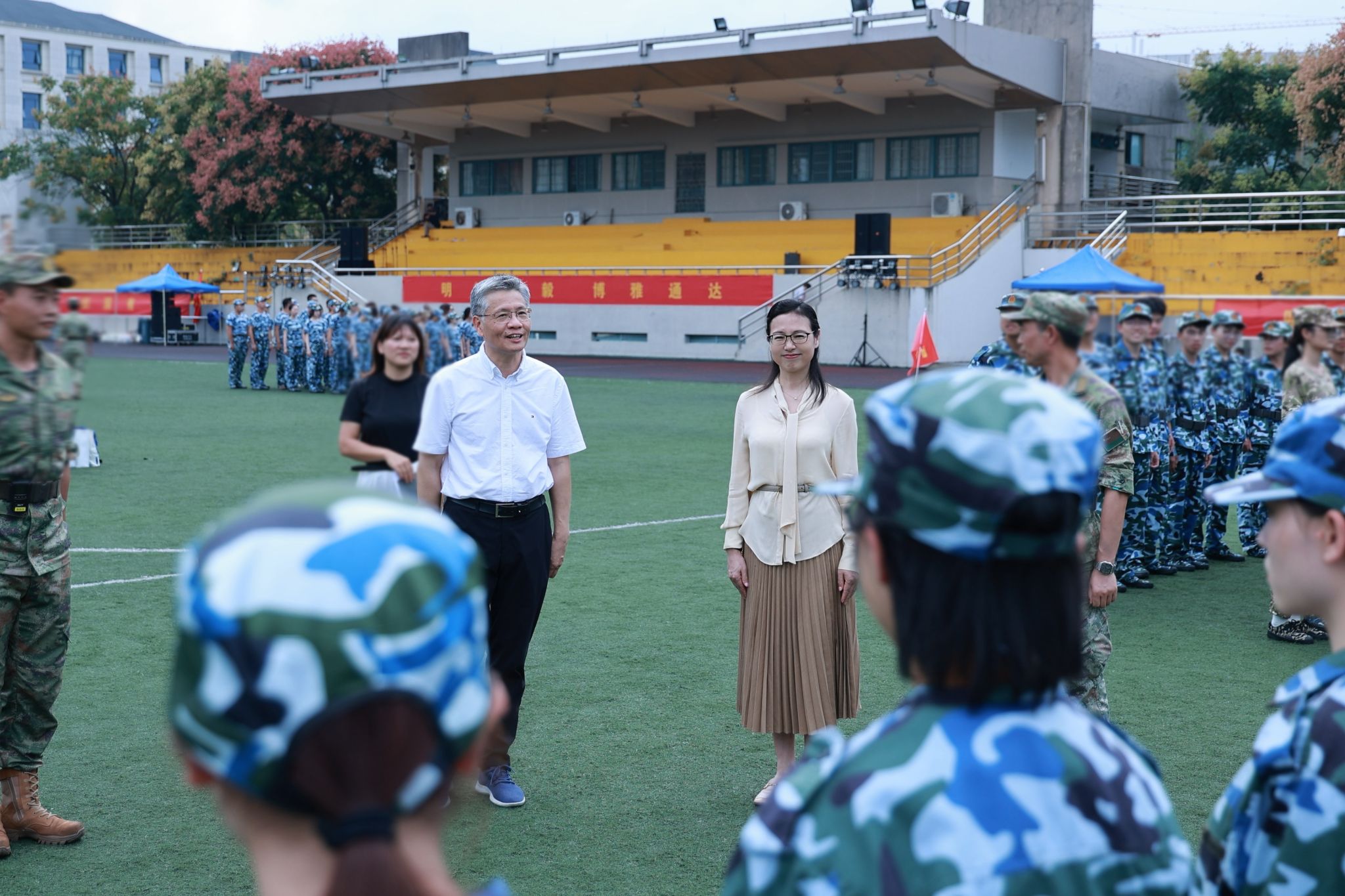 9月27日下午,一阵秋雨过后,军训场上各营方阵正按照军训大纲有条不紊地操练着,参训学生个个斗志昂扬,精神抖擞。校党委书记宣勇,校长、党委副书记张环宙来到操场,看望慰问2024级军训师生。