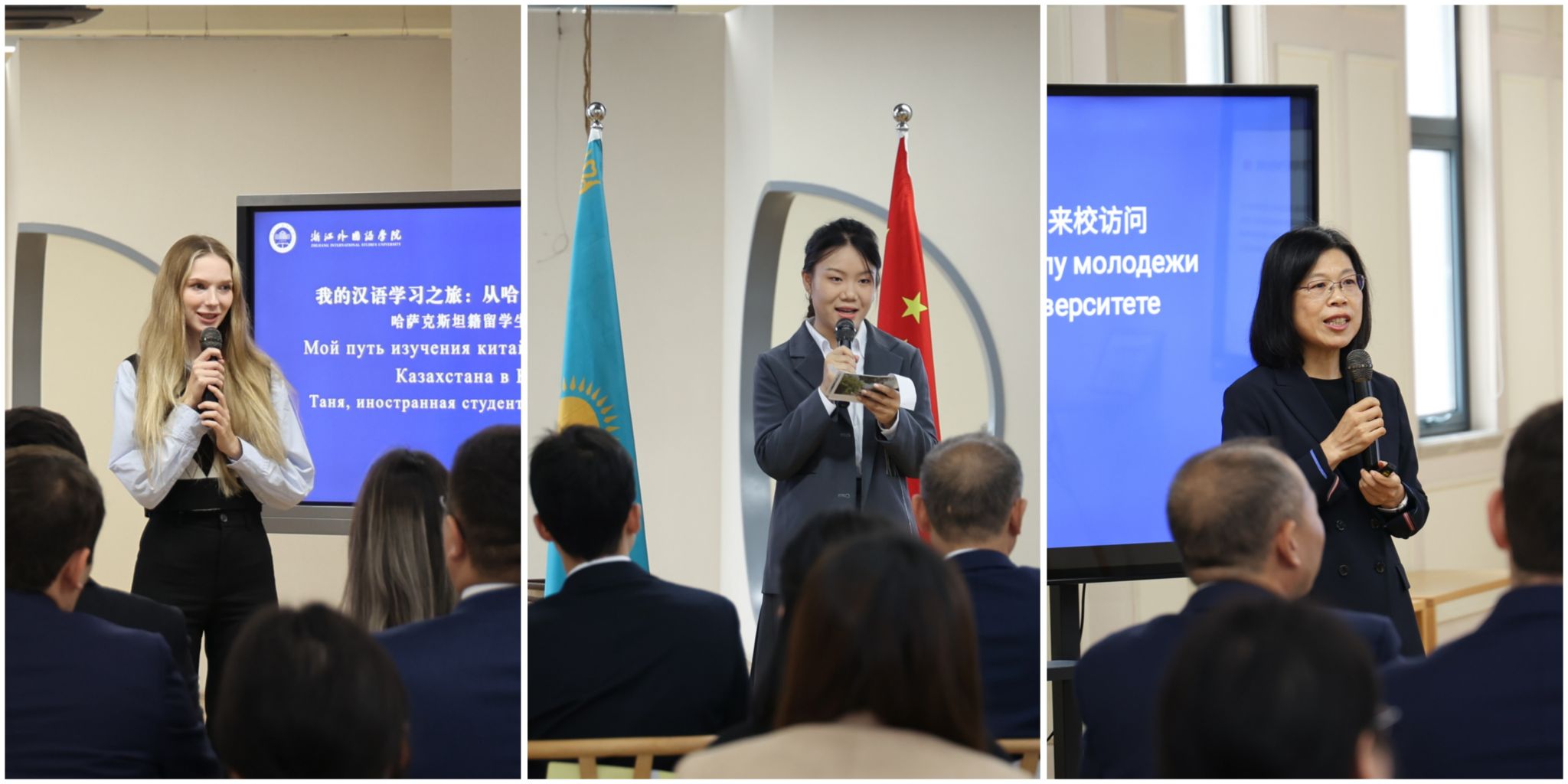 交流会上,杭州亚运会志愿者、22级俄语专业学生石志礼以“我与哈萨克斯坦的不解之缘”为主题,分享了在杭州亚运会上与哈萨克斯坦运动员之间的深厚情谊。哈萨克斯坦籍留学生塔尼娅分享了在浙外求学感受。商学院、创业学院副院长方美玉介绍了学院在就业创业方面的实践经验和成功案例。