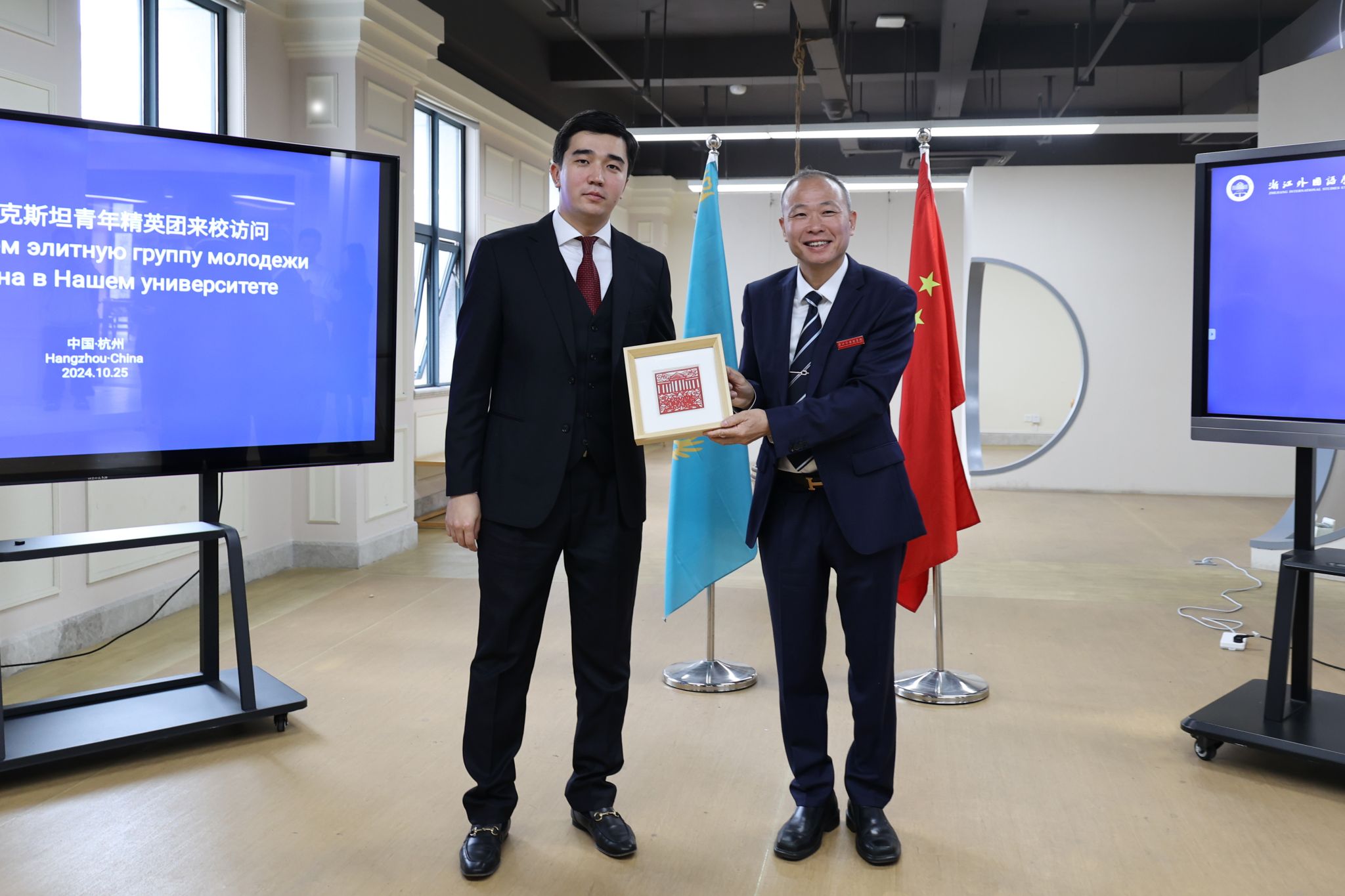阿布莱耶维奇表示,中哈关系进入新台阶,两国在经济和人文交流领域成果丰硕,哈萨克斯坦各州与中国各省往来密切,为青年缔结友谊提供了先导条件。他介绍了阿拉木图州的区位优势和发展规划,表示愿意支持两地的青年交流,并争取打造一批年度传统活动。现场,他还为浙外写下了寄语,“祝浙外日益辉煌,祝浙外青年前程似锦”,并表示希望双方能够进一步加强交流与合作,共同推动中哈关系不断向前发展。