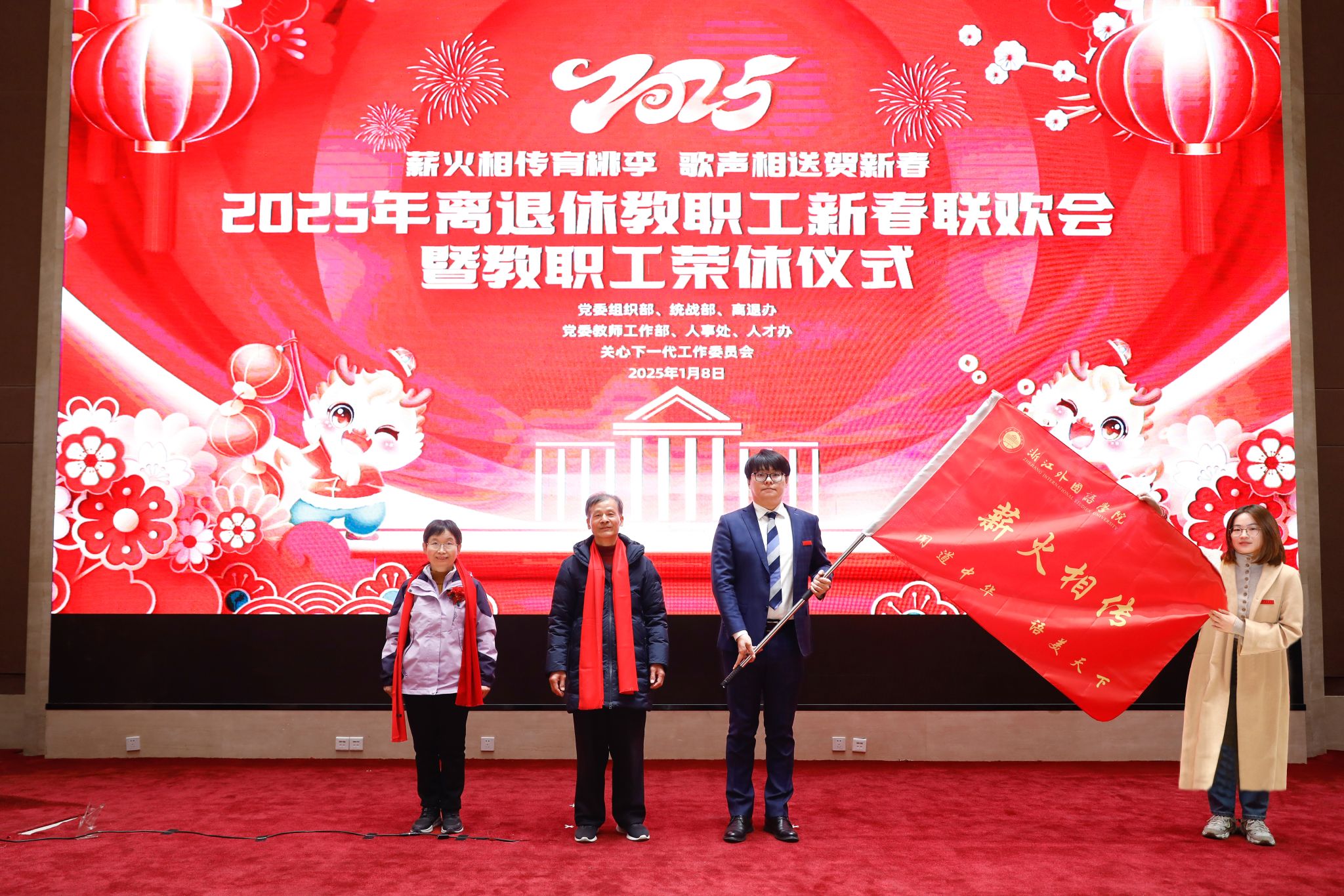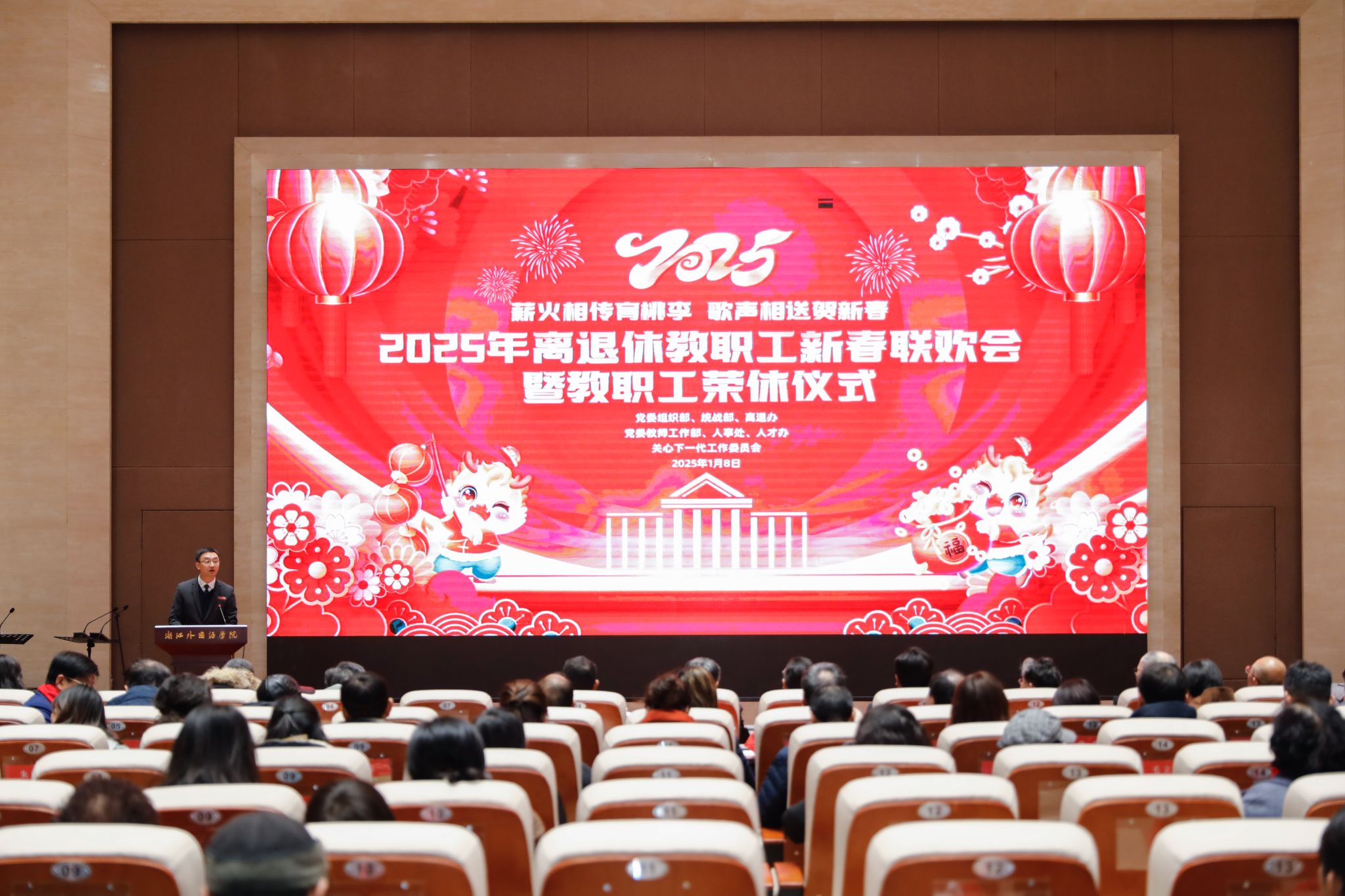 提灯引路,育梦成光,初心为磐,桃李满园。1月8日,同文堂一片温馨祥和,学校举行2025年离退休教职工新春联欢会,与此同时,饱含敬意与深情的教职工荣休仪式也在此同步开启,以一场温暖盛会,敬颂师恩,展望新程。校党委书记宣勇致辞,校长、党委副书记张环宙,党委副书记严齐斌、徐勇,副校长、党委委员姚旻,党委委员、宣传部部长洪明,党委委员,组织部、统战部部长傅尧力出席。姚旻主持。