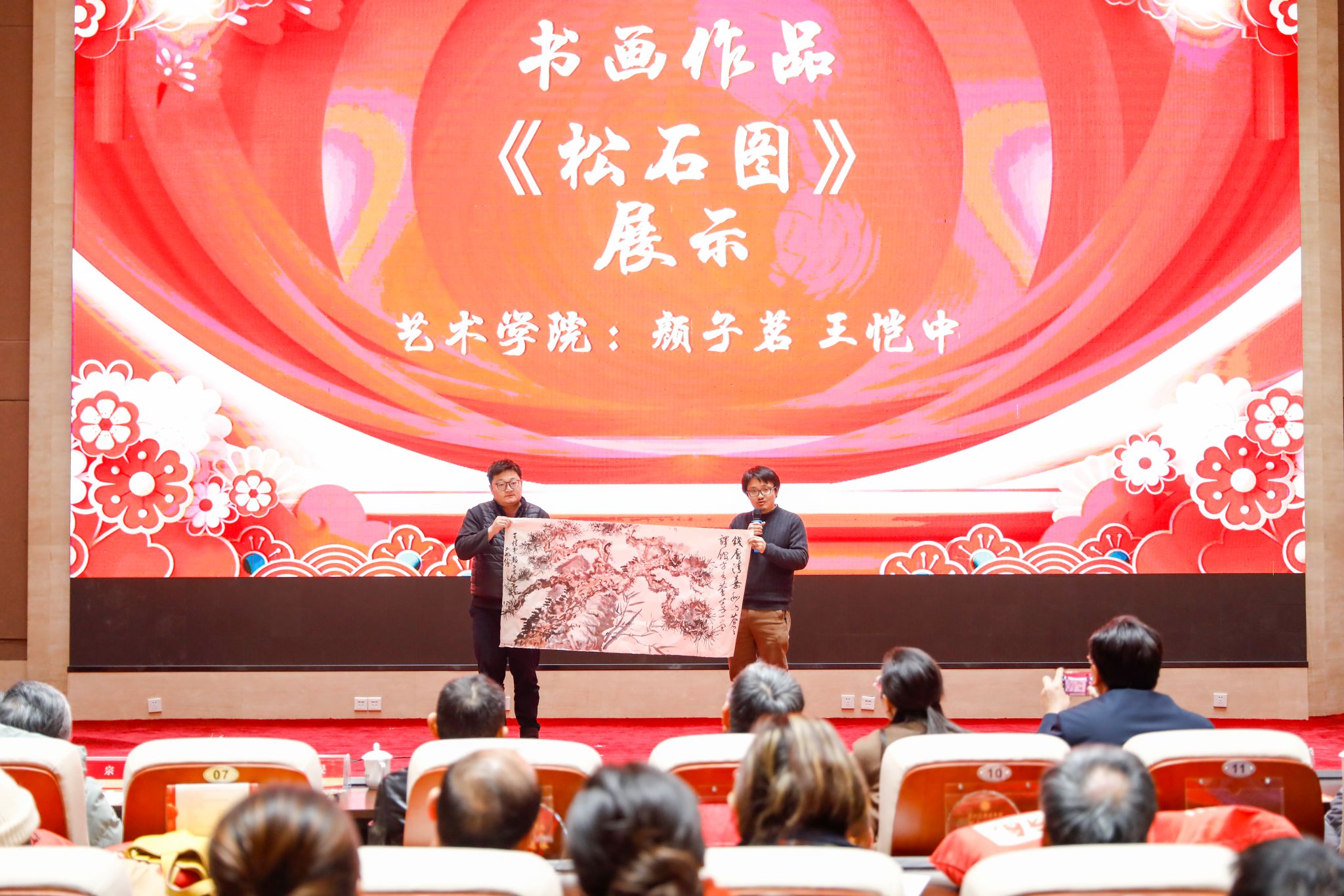 在随后的联欢环节,离退休教职工金秋合唱团带来了精彩的《爱永在》《两地曲》《相遇》《今夜无眠》《世界之巅》《深深的海洋》等歌曲表演,多种语言和萨克斯共同演绎的《友谊地久天长》将演出推向高潮,饱含情感的演出表达了全体离退休教职工对学校和师生深厚的情谊,对学校再创辉煌明天的美好祝愿。TheNew合唱团也怀揣着敬意与感恩,献上小组唱《这世界那么多人》。艺术学院青年教师还为荣休教职工现场创作书画作品《松石图》,送上诚挚的祝福。