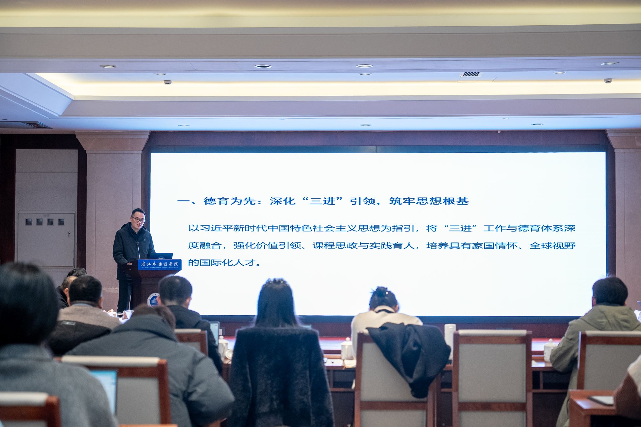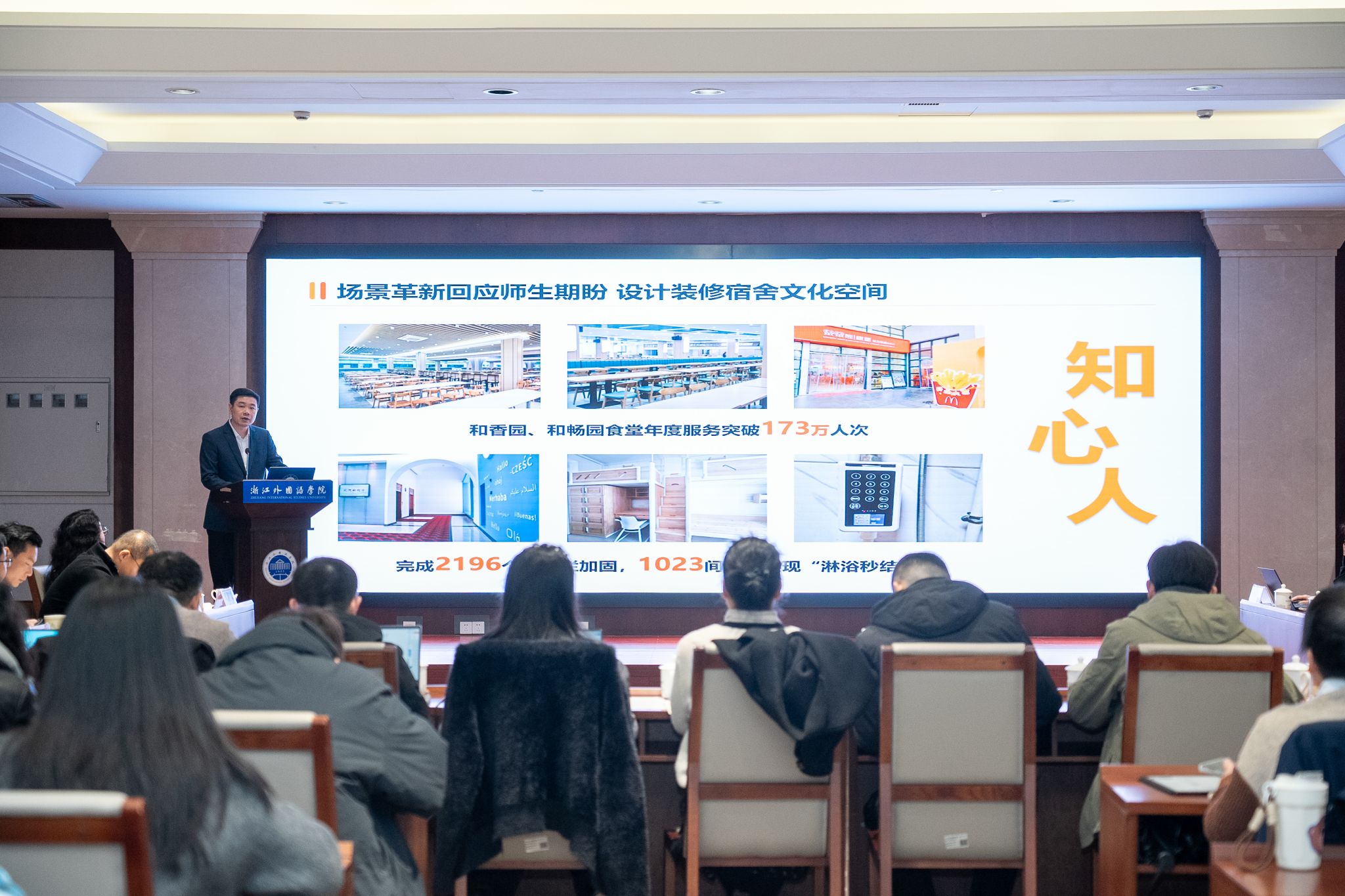 徐勇充分肯定了上一年学生思政工作方面取得的成绩,并对各发言单位的相关工作作点评。他指出,思想政治工作作为学校各项工作的生命线,关乎学校的未来发展,做好今年的工作尤为重要。围绕新一年的学生思政工作,他强调,一要强化思想引领,链式推进思政工作。要把握工作本质,一体集成,环环相扣,秉持长期主义。二要注重专业融会,推动特色发展。聚焦学校发展定位、人才培养目标定位,发挥专业优势,推动“四个一”工程具体化,结合专业推动学生工作特色发展。三是深入学生,务实帮助学生解决困难。要坚持做青年朋友的知心人、热心人、引路人,通过建立辅导员述班情制度等,提供精准帮助,提升学生的获得感。四是推进品牌建设和创新工作。要树立品牌精品意识,认真思考人工智能背景下辅导员如何应对挑战,发挥出不可替代的作用,为学生的成才成长更好赋能。五是狠抓队伍建设,狠抓人文关怀。要持续提升辅导员队伍能力素质,关心关爱辅导员,打造一支政治坚定、本领过硬、学生信任、组织放心的高素质辅导员队伍。