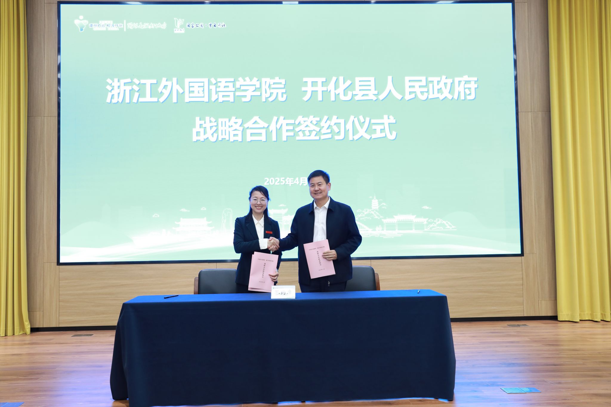 张环宙表示,积极回应地方政产学研用需求,加强校地合作,是高校的重大政治使命,也是高校服务地方经济社会发展和实现自身内涵式发展的重要路径。浙外始终以服务地方经济社会发展为己任,积极推进校地合作,长期以来都与开化保持紧密的合作与交流,并取得了丰硕成果。此次签署战略合作协议,标志着双方合作迈入了新的阶段,学校将立足开化所需、浙外所能,赋能开化县积极融入国内大循环、国内国际双循环发展大局,建设成为“山区开放示范地”。希望通过校地资源优势互补,以人才培养为根基、以产业创新为引擎、以文化传承为纽带,推动双方在教育赋能、经济协作、文旅融合、跨境电商、人才培育等领域实现进一步合作共赢。