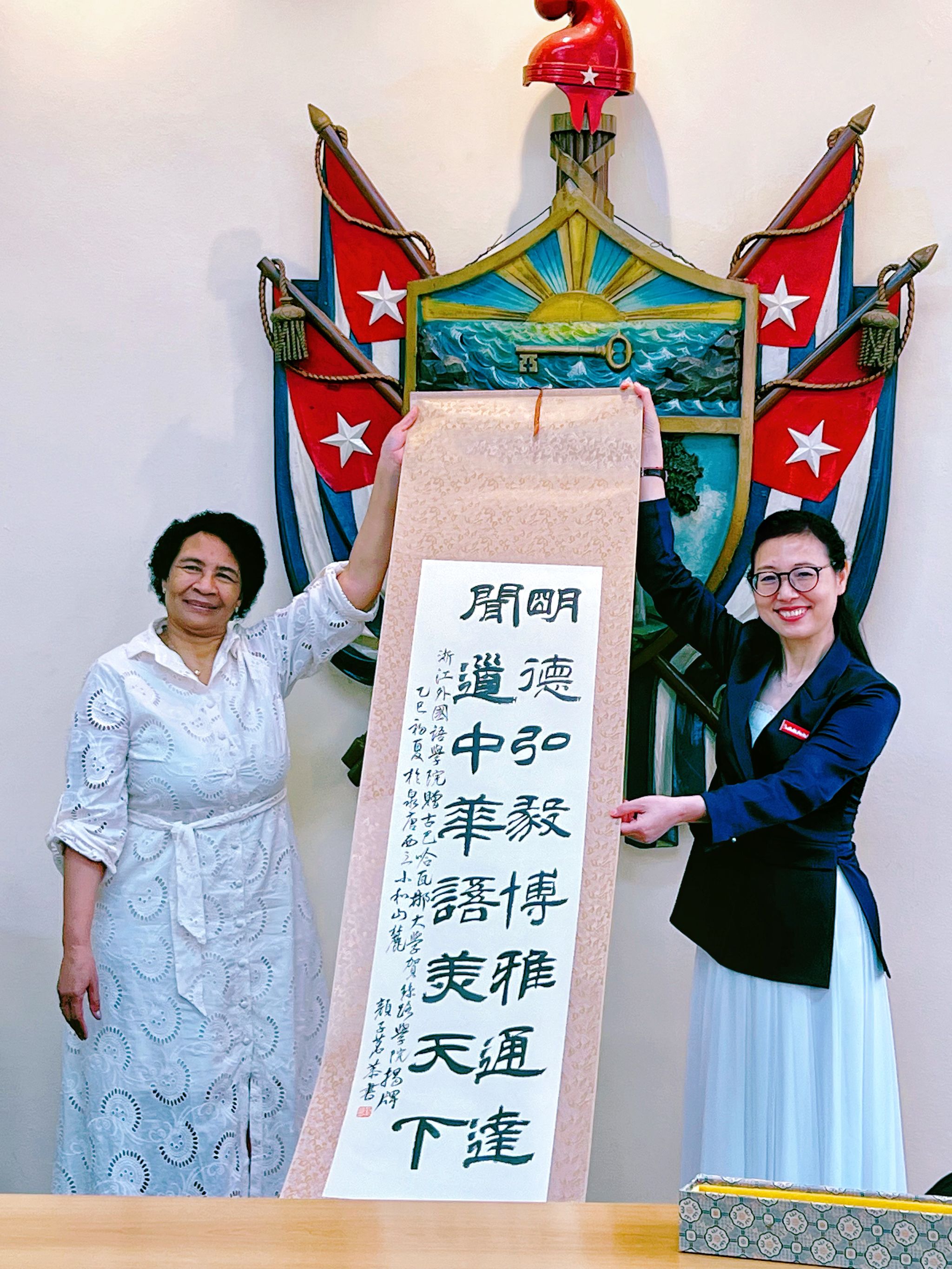 仪式后,张环宙与米里亚姆代表两校签署学生交换协议和金砖国家经贸合作科研平台合作协议,为两校在人才培养、科学研究等领域开展合作奠定基础。张环宙向米里亚姆赠送书法作品,对哈瓦那大学深厚的历史底蕴、卓越的学术成就以及在中古文化交流中发挥的桥梁作用表示赞赏,表示浙外将以浙外校训和浙外精神为遵循,为深化中古交流搭建更多教育合作平台,推动两校师生互学互鉴,以语言为纽带、以学术为依托,助力中古人文交流迈向新高度。