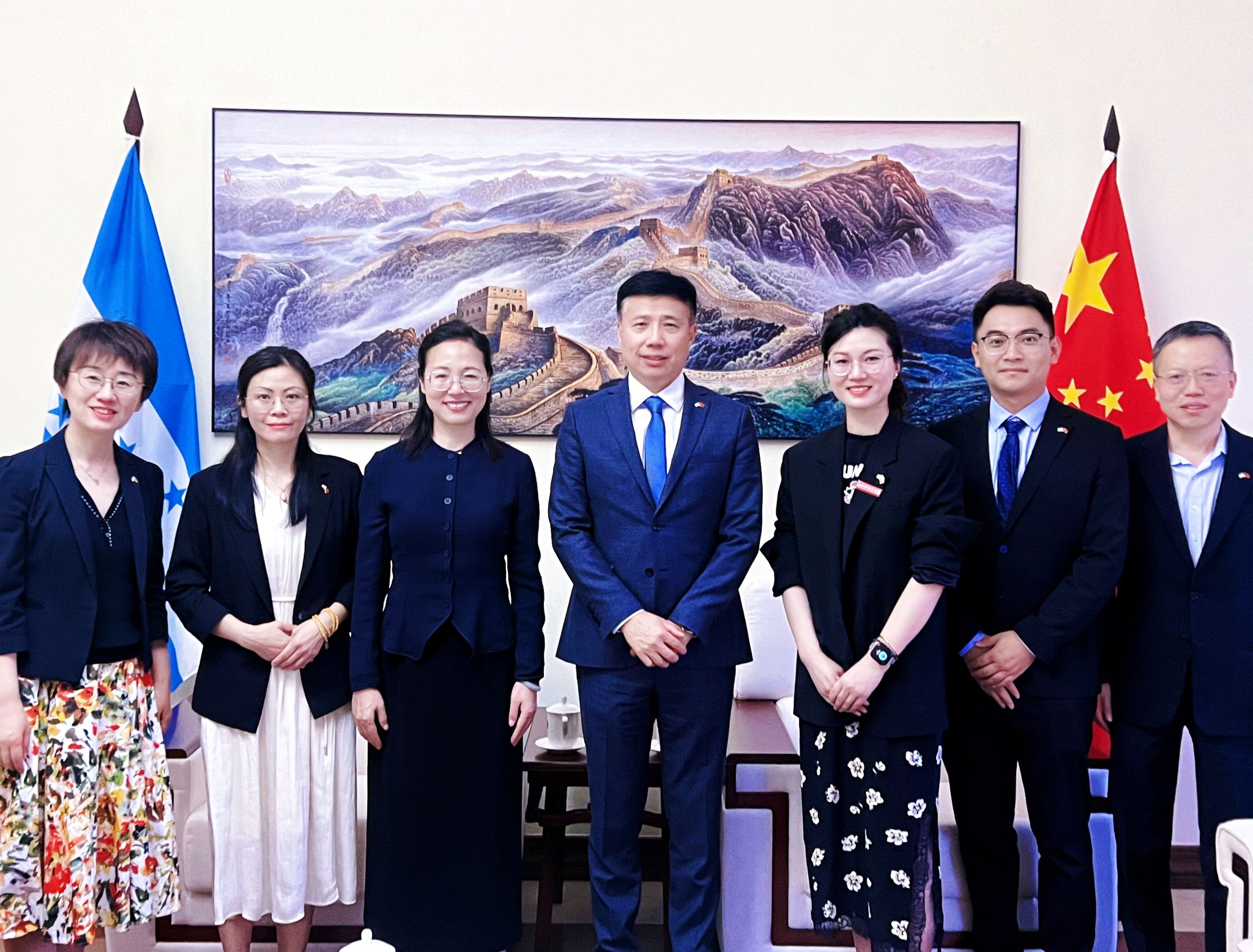 在中国驻洪都拉斯大使馆,张环宙扼要介绍学校办学历史与发展现状,汇报常年深耕拉美地区的举措与成效,明确表达办好洪都拉斯首家孔院的信心与决心。于波充分肯定浙外的战略选择,希望浙外能发挥特色优势,推动孔院建设成为展示中国文化的窗口、促进文化交流的桥梁、增进中洪友谊的纽带,展现中华文化的凝聚力、感召力和向心力,推动中洪两国实现更创新、更多元、更广泛的合作。