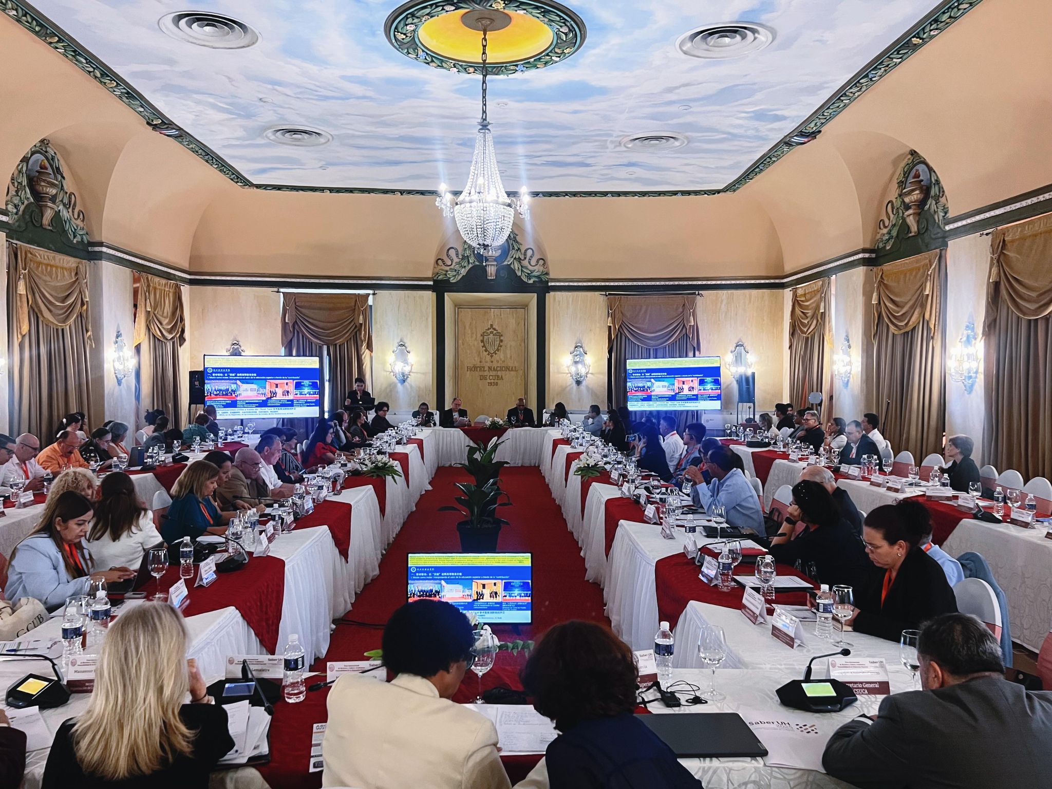 5月28日,代表团还受邀出席“哈瓦那大学2025智库大会”校长论坛,作题为《自强卓越 创新发展:浙外管理的实践与思考》的主旨演讲,从“使命驱动、挑战应对、开放合作”三维度阐释中国高校治理智慧。古巴高等教育部部长瓦尔特·巴卢哈·加西亚、联合国教科文组织哈瓦那办公室主任安妮·乐梅斯特、拉丁美洲社会科学院秘书长丽贝卡·弗拉迪尼、伊比利亚美洲大学委员主席菲利克斯·劳辛、联合国教科文组织拉美及加勒比地区高等教育国际中心主任弗朗赛克·佩德罗及近20余所高校代表参加会议交流。