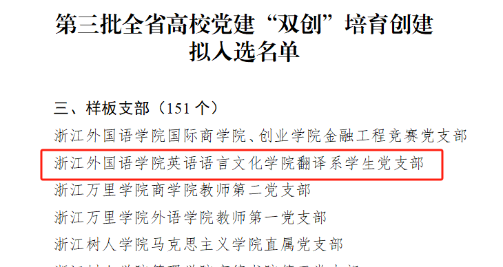 学院党委始终坚持立德树人根本任务,牢记为党育人、为国育才的初心使命,形成党建与事业发展深度融合、同频共振的良好局面。翻译专业学生党支部入选浙江省党建样板支部,学院党委获批校级党建工作“标杆院系”培育创建单位,党建“四个融合”试点单位,师生在省思政微课、微型党课大赛中多次获奖。
