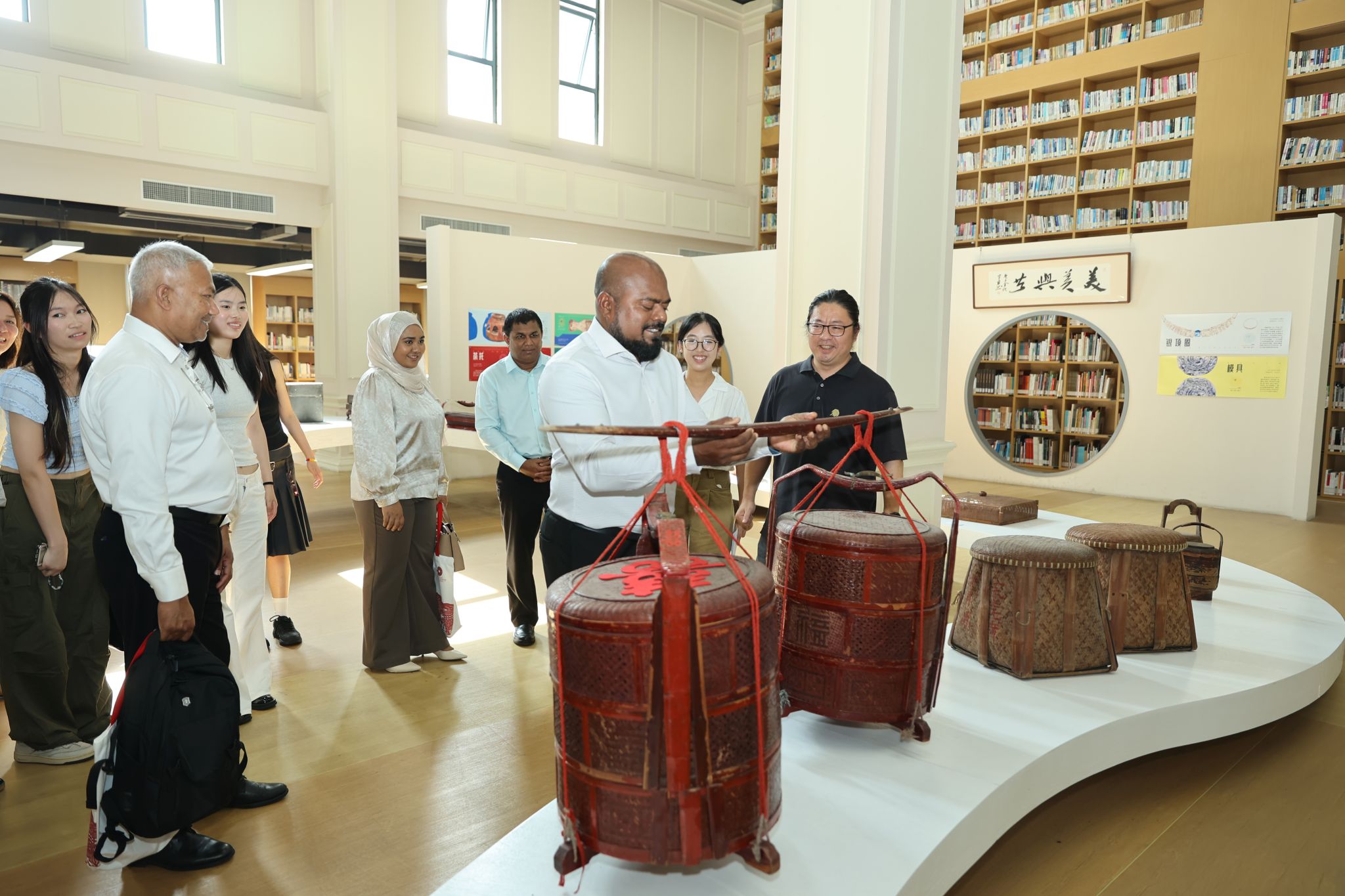 欢迎仪式后,马尔代夫官员们参观了“文明长船共水生”民俗器物志展览。当艺术学院策展人讲到中国青瓷通过海上丝绸之路传入马尔代夫时,外宾们纷纷拿出手机里的家乡博物馆照片,展示当地出土的中国瓷片。跨越时空的文物呼应,让“文明互鉴”变成了可触摸的历史对话。22级英语专业的张林娜在活动后记中写道:“这次经历让我明白,文明互鉴不仅仅是宏大的叙事,它还体现在每一次眼神交流和真诚对话之中。”