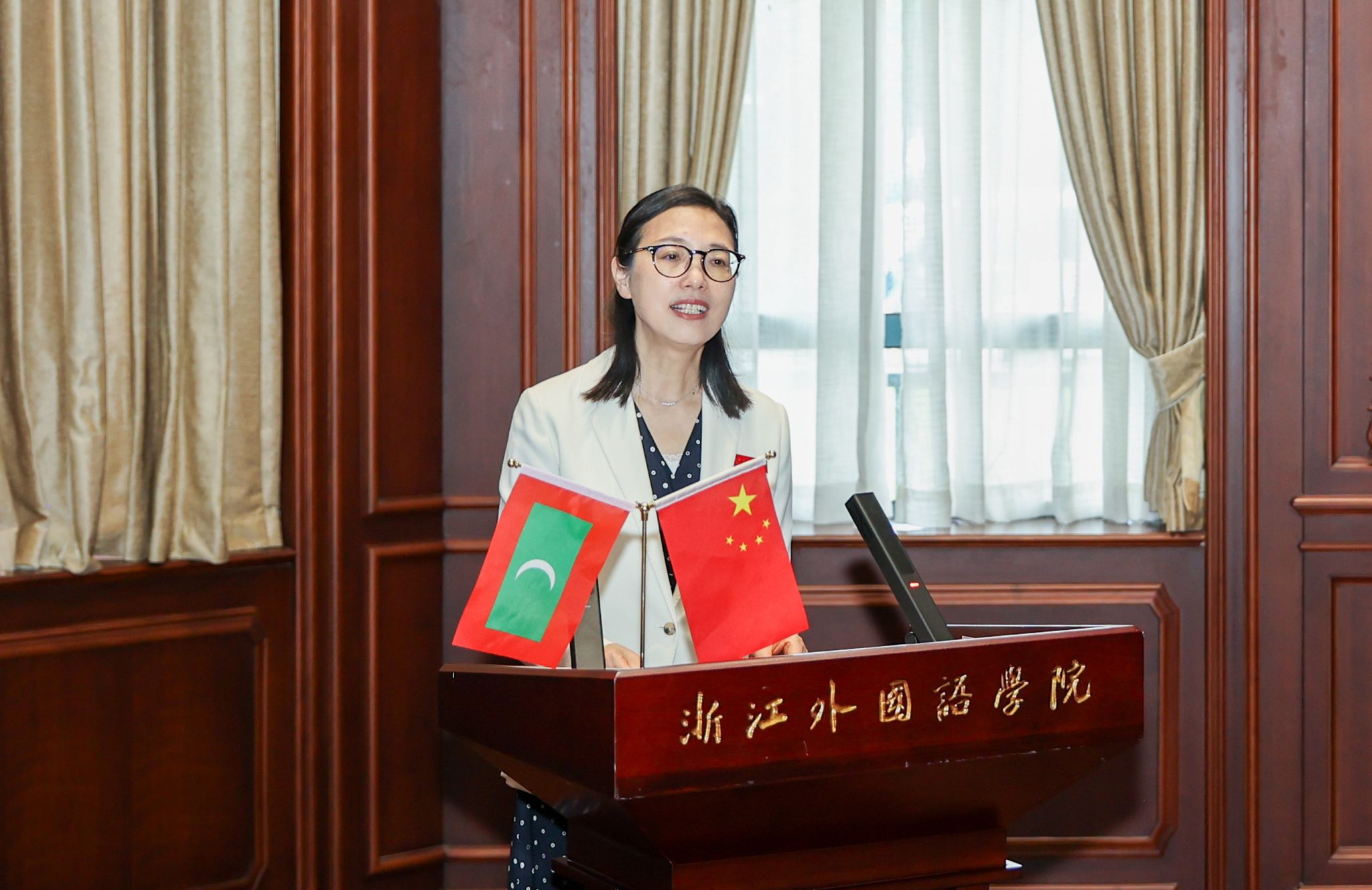 张环宙回溯了中马文明渊源,以及浙外与马尔代夫的友好往来。她表示,浙外的校园迎来马尔代夫多个领域的“领航者”,以“文明长船共水生”为主题相聚于此,高校更应成为不同文明的“学术港口”,通过教育、青年和文化交流,为文明长船的行稳致远提供不竭动力。浙外期待与马尔代夫以“水”为魂、以“船”为桥、以学术为基,在生态文明保护、文明交流互鉴和青年人才培养等方面开展合作,共同为两国的文明发展贡献力量。
