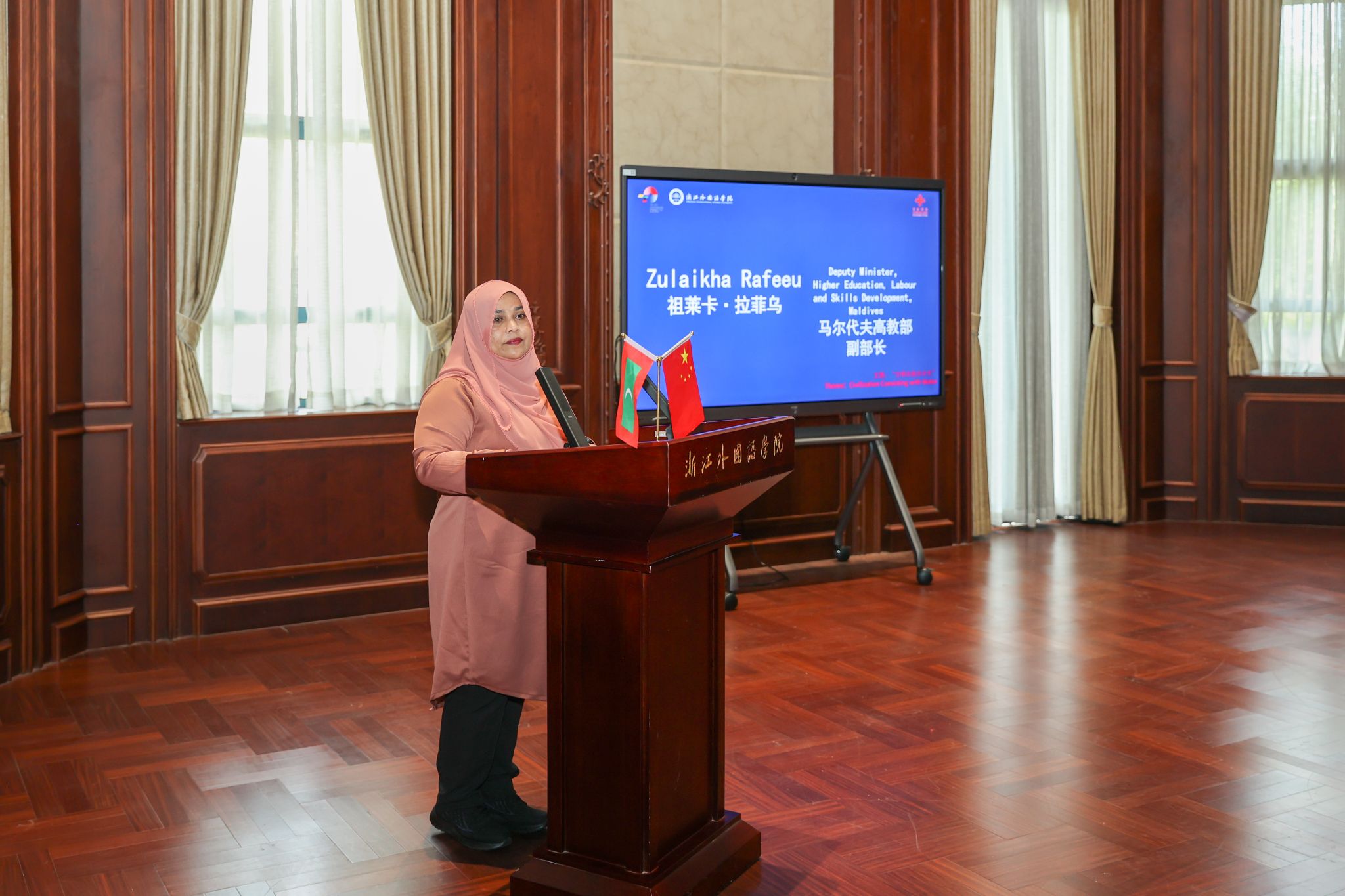 马尔代夫高教部副部长祖莱卡·拉菲乌代表团组发言。她指出,马尔代夫虽由珊瑚礁群岛组成,却与中国共享海洋文明的基因。她期待以研修团为起点,让更多马尔代夫学子通过浙外的平台,成为文明互鉴的“摆渡人”。哈西姆回顾了他从一名中资企业协调员到马尔代夫高级官员的成长经历,希望能为两国民心相通、民间友好搭建更多的桥梁。