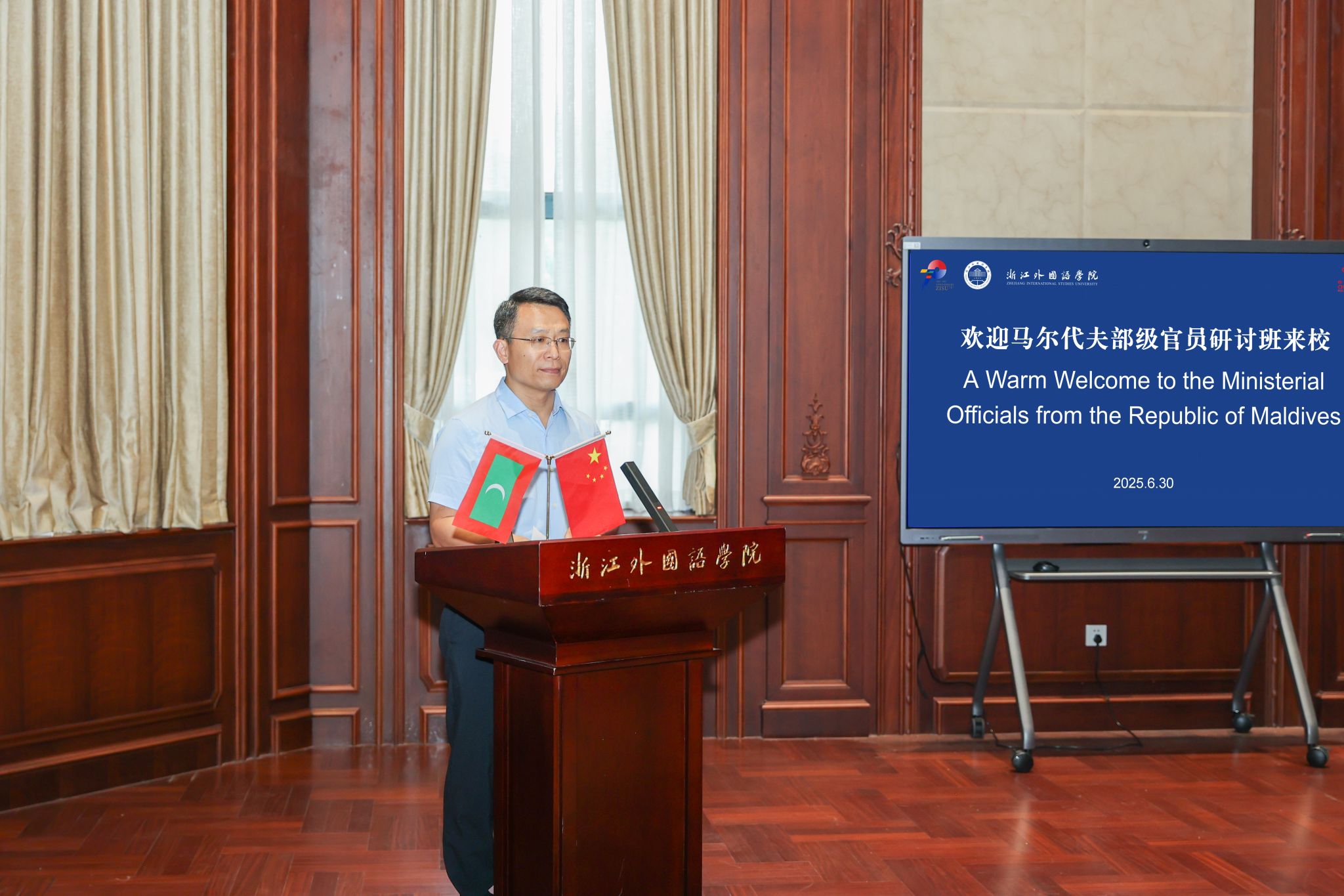 6月30日,学校迎来又一批远道而来的客人——来自马尔代夫总统办公室、地方治理部、高等教育与科技部等九个部门的13名副部长及其他高级官员。校长、党委副书记张环宙出席欢迎仪式。副校长、党委委员毛振华主持。这场由商务部国际商务官员研修学院主办、浙江外国语学院协办的“马尔代夫-中国·浙江参观考察活动”,如同一座架设在两国之间的友谊桥梁,让来自印度洋岛国的政要们与浙江的人文底蕴、发展活力来了一场深度邂逅。