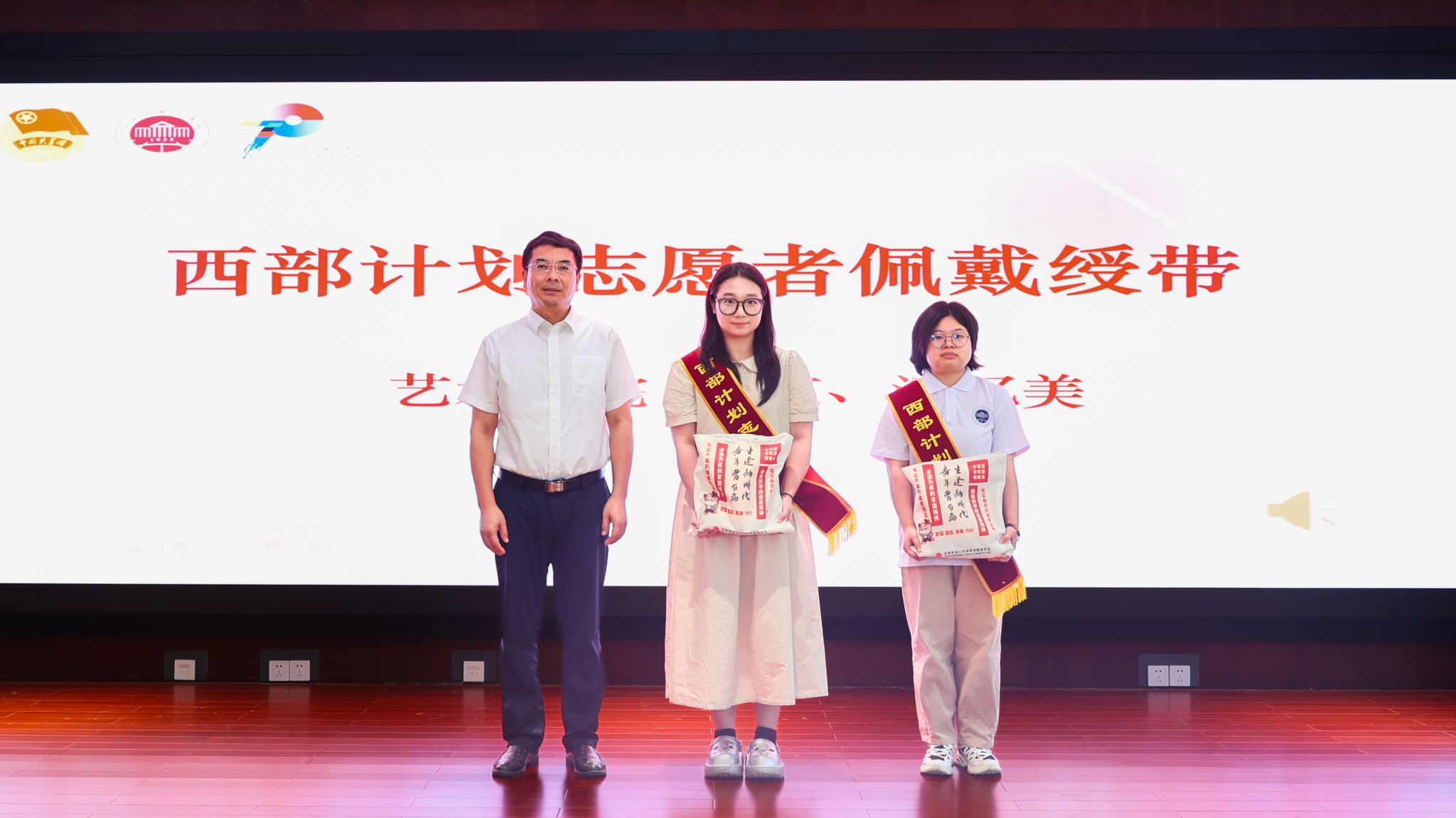 徐勇为2025年西部计划志愿者代表佩戴绶带,勉励他们在基层服务中践行光荣的青春使命。